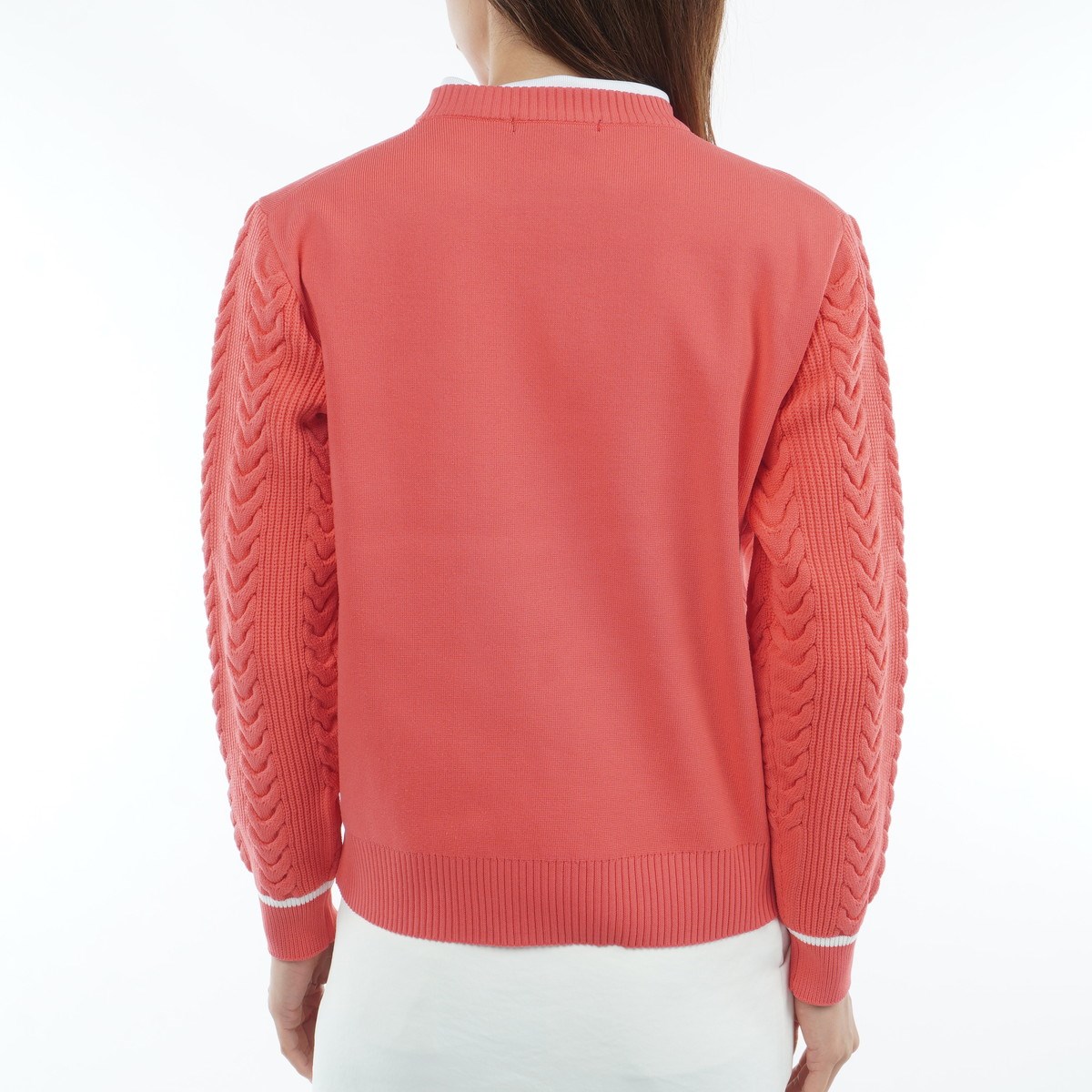 ケーブル編みの袖がアクセントになり、スタイリッシュな印象を与えます。