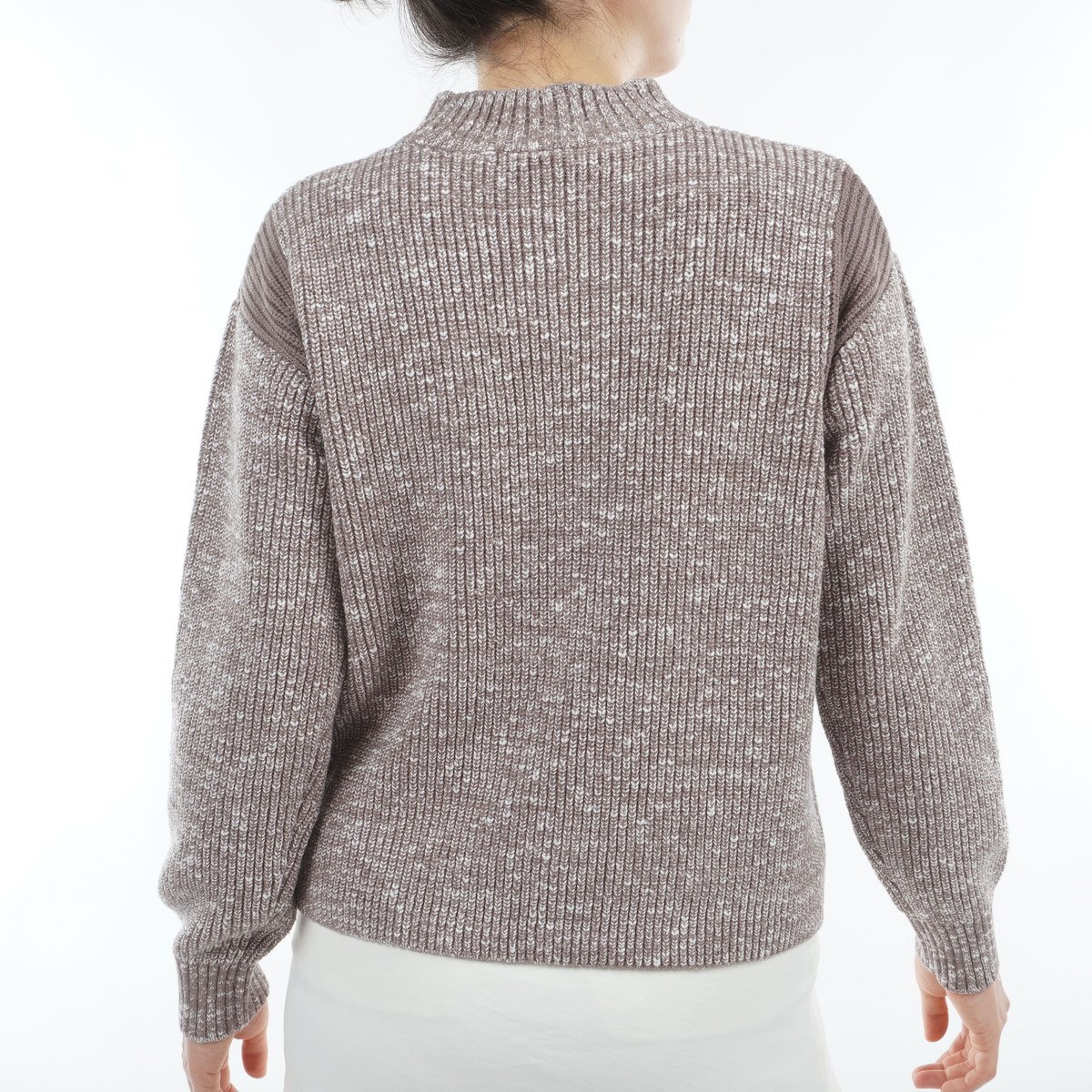 細かな毛足のフェザーヤーンとスラブ糸をMIXさせることで、雰囲気のある片畦ニットに仕上げました。