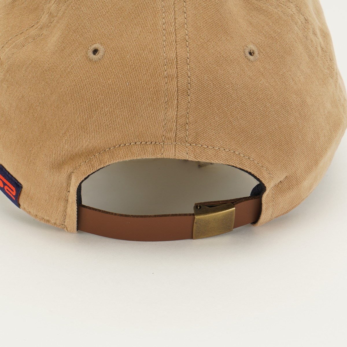 シンプルなデザインながらワッペン風のロゴや配色のフェイクレザーを使用した後ろのアジャスターベルトがアクセントに。