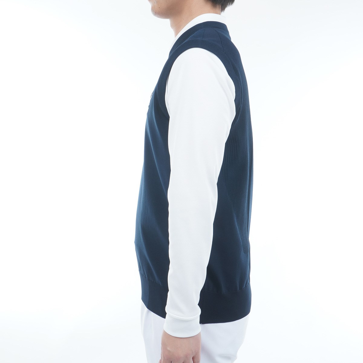 ハイゲージのポリエステル素材を使用した浅Vネックのニットベスト。
