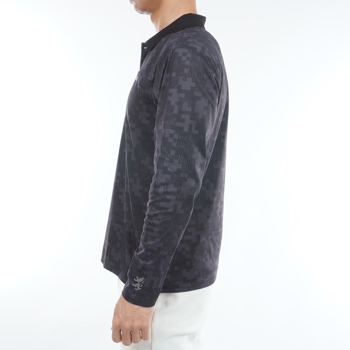 ロゴをミックスしたモザイク風カモフラージュ柄の昇華プリントが特徴の長袖ポロシャツ。