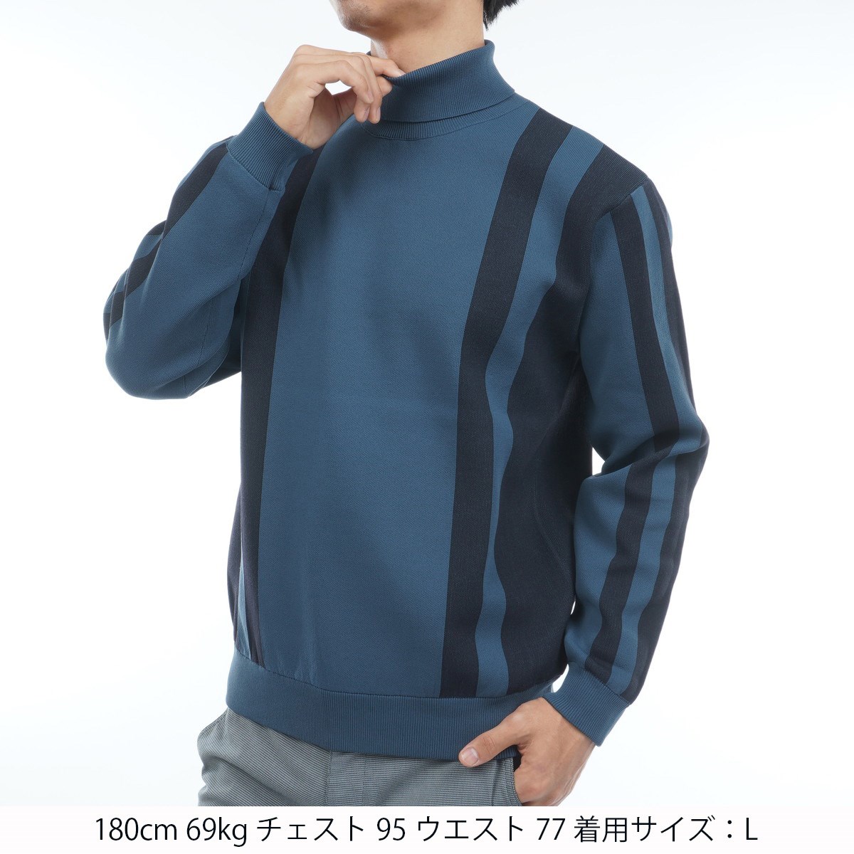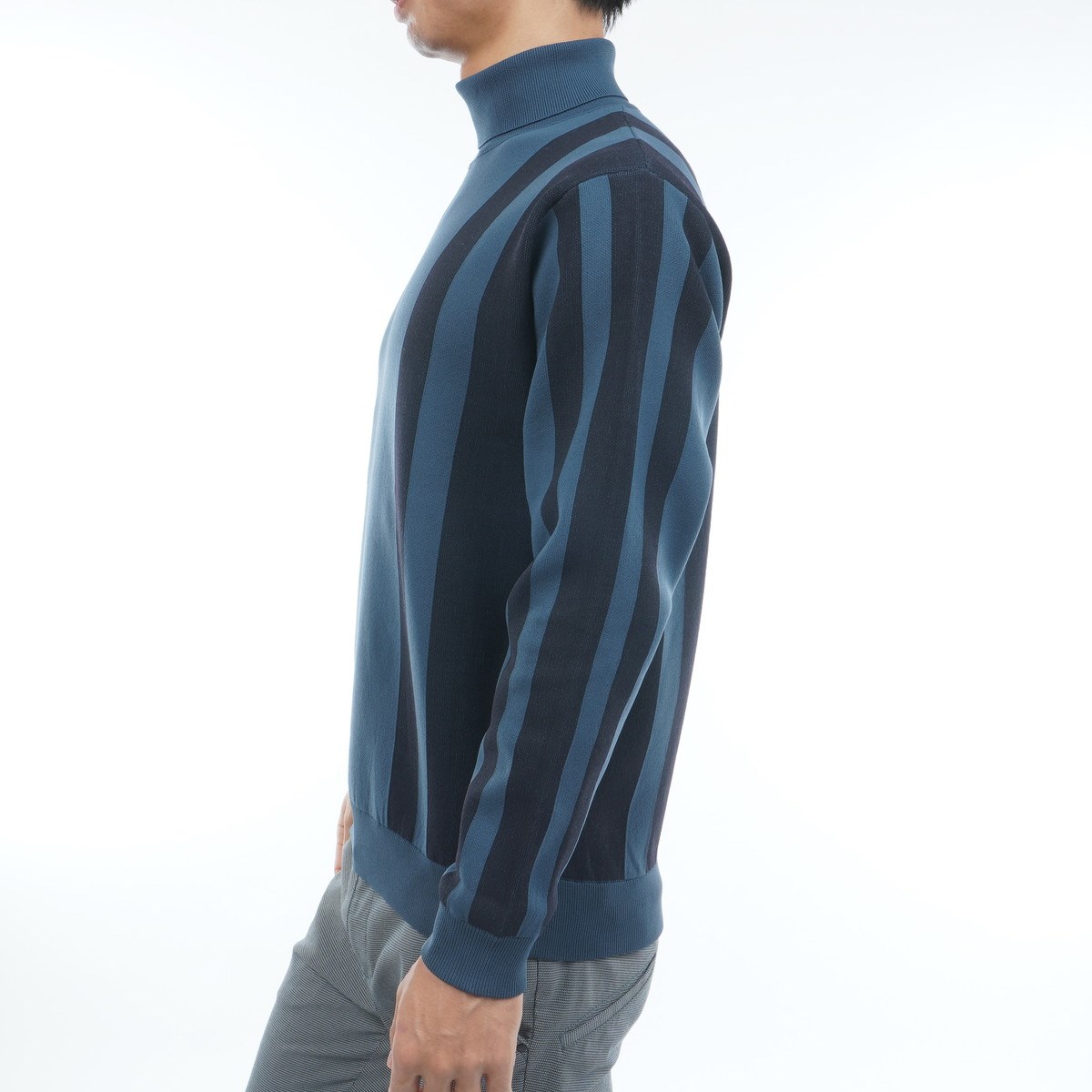 変形のストライプジャガード柄を身頃・袖に配置したストレッチ性が高い、ハイエンドなハイネックセーター。