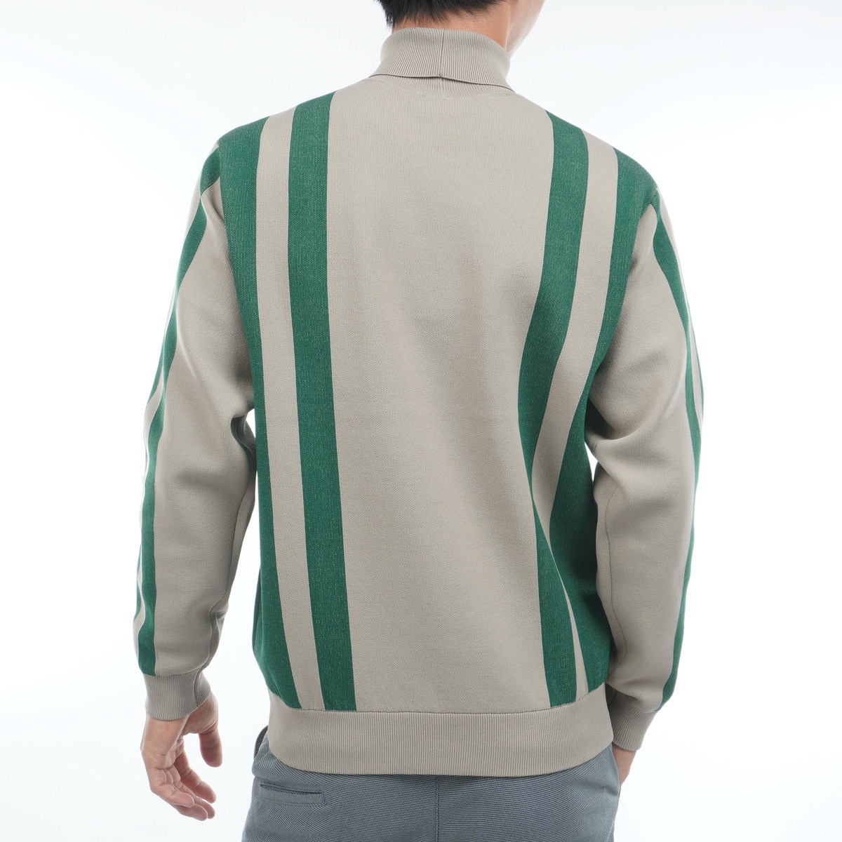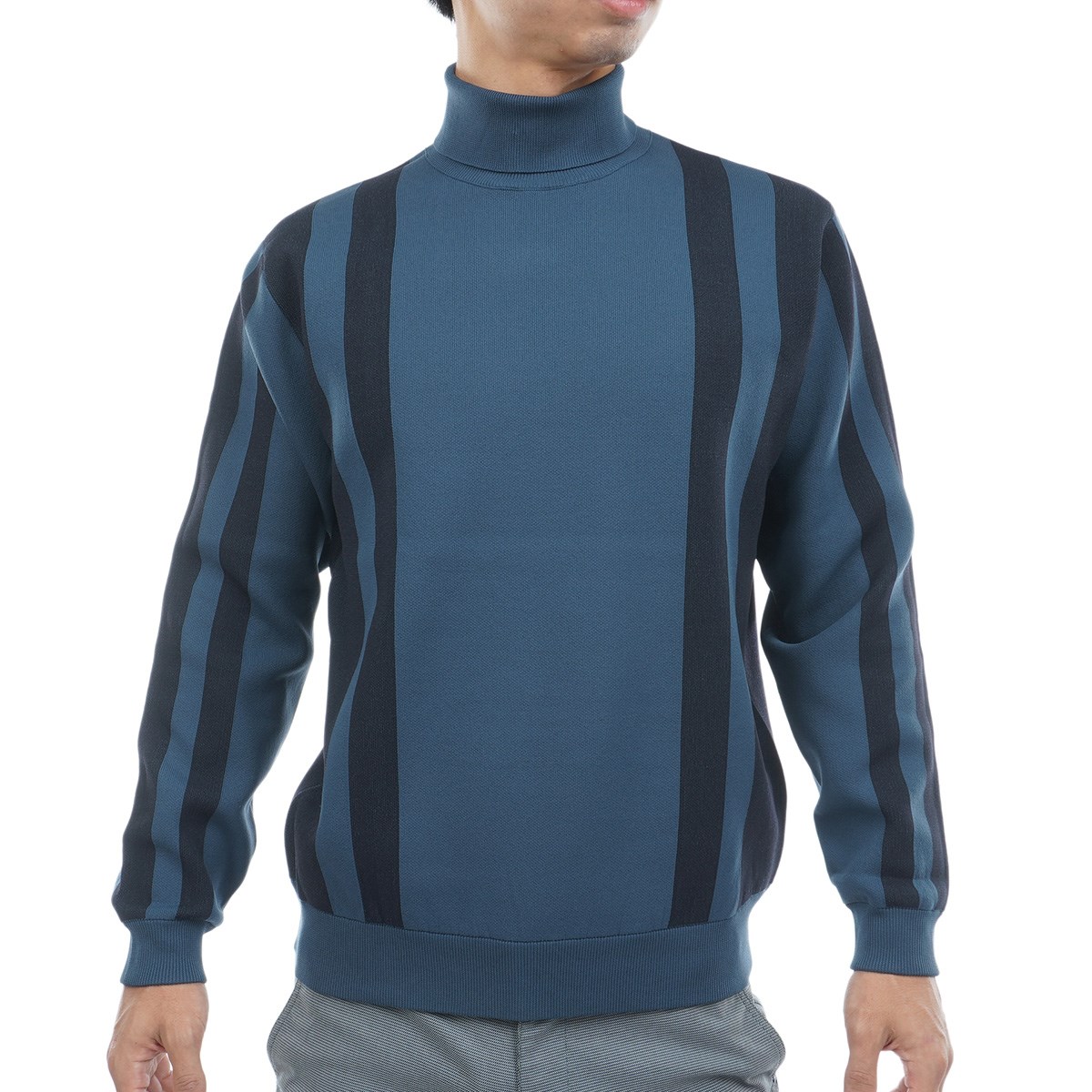 変形のストライプジャガード柄を身頃・袖に配置したストレッチ性が高い、ハイエンドなハイネックセーター。