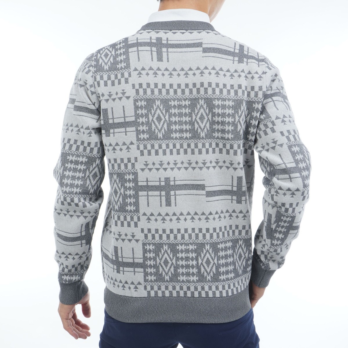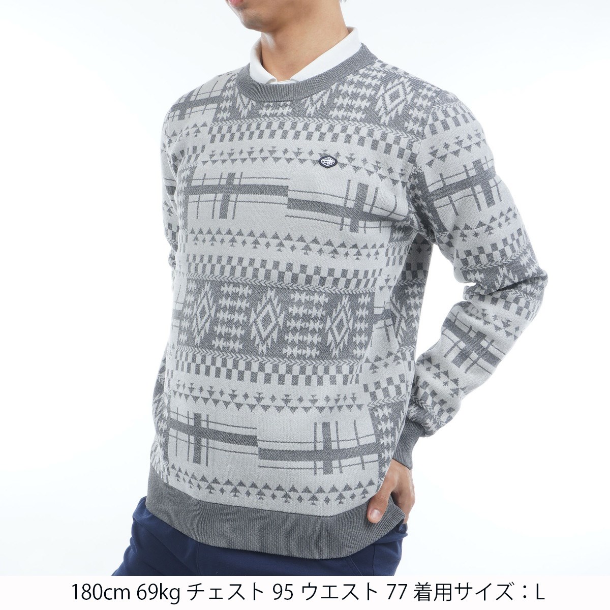 クルーネックニットで大胆なパターン柄がゴルフ場で映えるアイコニックなアイテム。