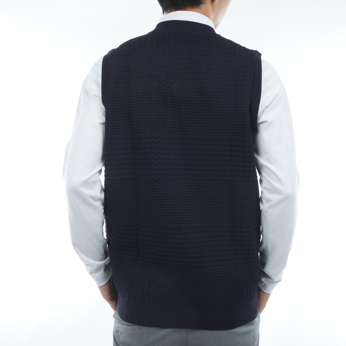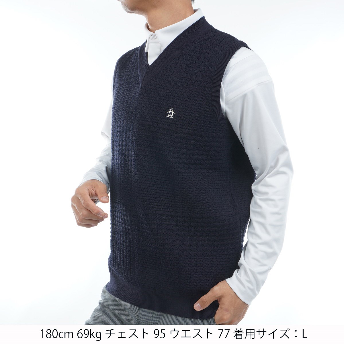 ・Vネックのデザインは、インナーのシャツと重なることなく、すっきりとした印象を与えます。重ね着してももたつかず、スマートな着こなしが可能です。