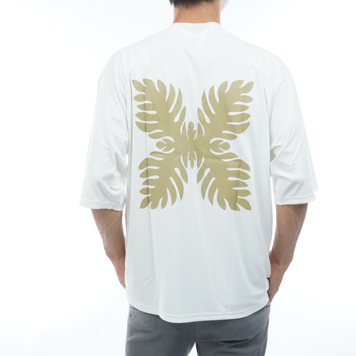 バックにはアイコニックなLaua’e(ラウアエ)と呼ばれるハワイでお祝い事や装飾で使われる伝統的な植物をモチーフにしたハワイアンキルト柄がプリントされインパクトある1枚。