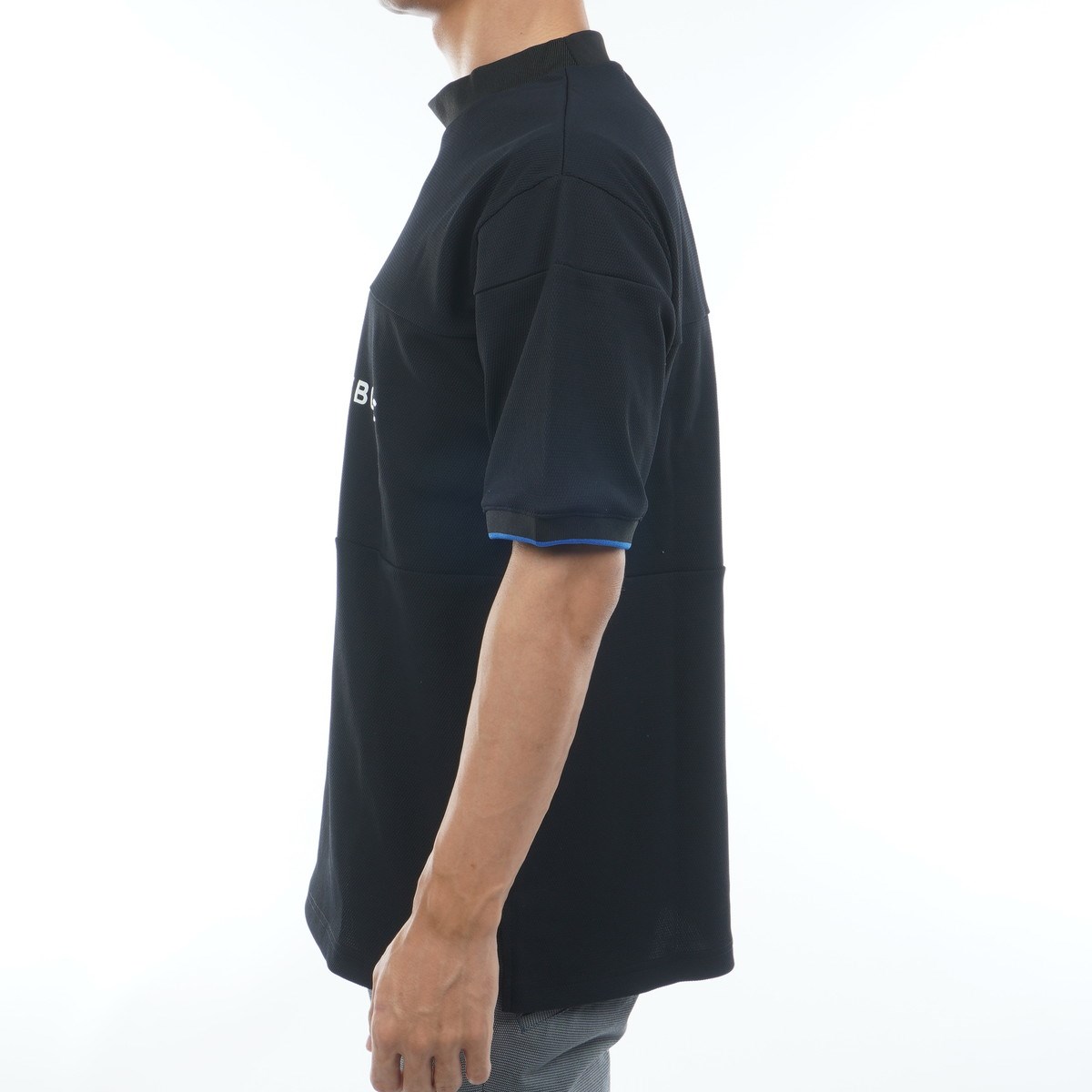 特殊な糸を使って編まれたポップコーンニット素材のモックネック半袖シャツ。