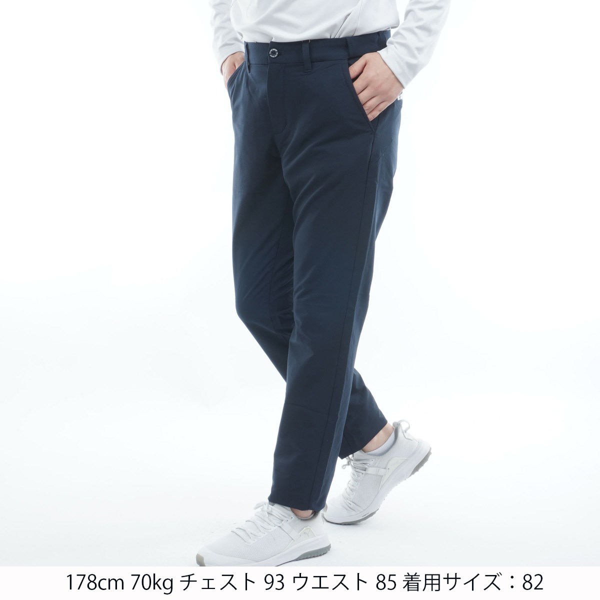 85:ウエスト(A)82、ウエスト(B)96、ヒップ102、股上27.5、股下82、わたり幅34.5