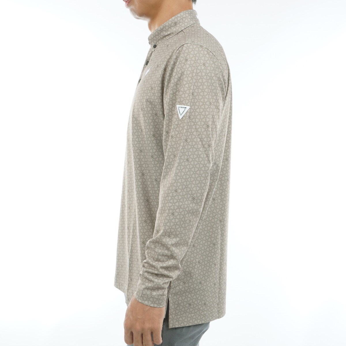 ■トライアングルを幾何学模様にアレンジした、落ち着いた印象の総柄デザイン長袖ポロシャツです。