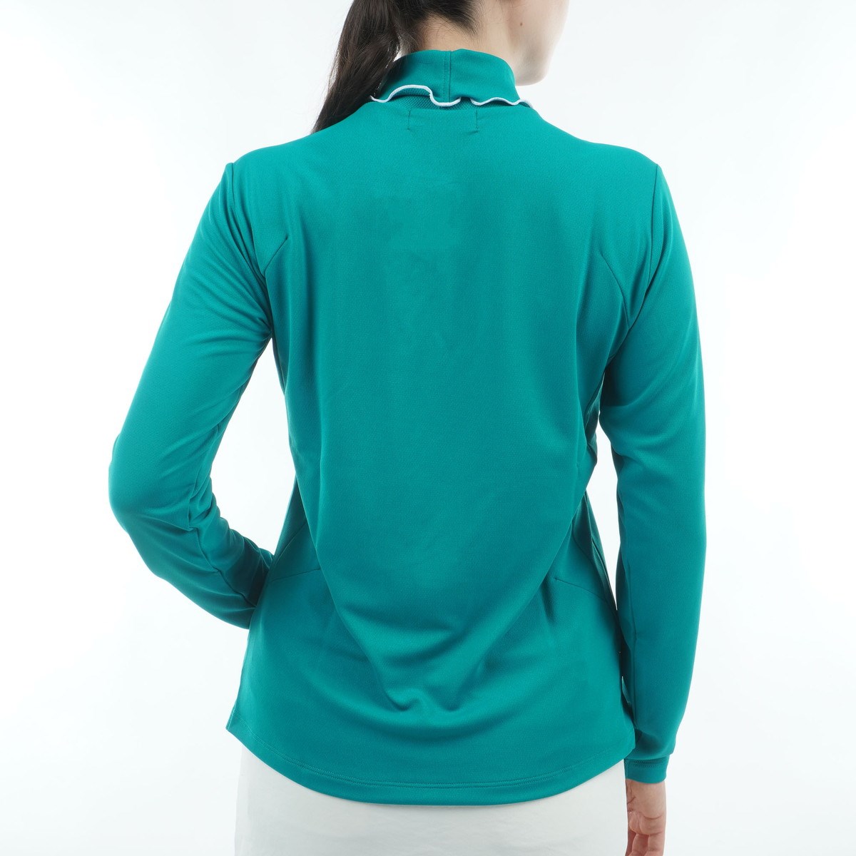 襟先に施されたメローデザインが可愛らしい、モックネック長袖シャツ。