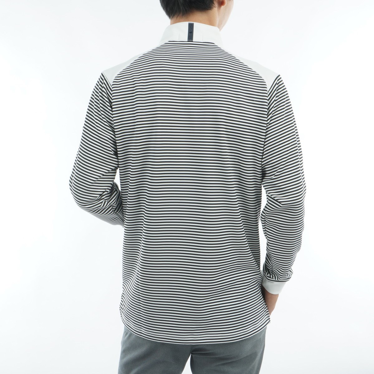 ボーダー切替デザインの保温ハーフジップ長袖シャツ。
