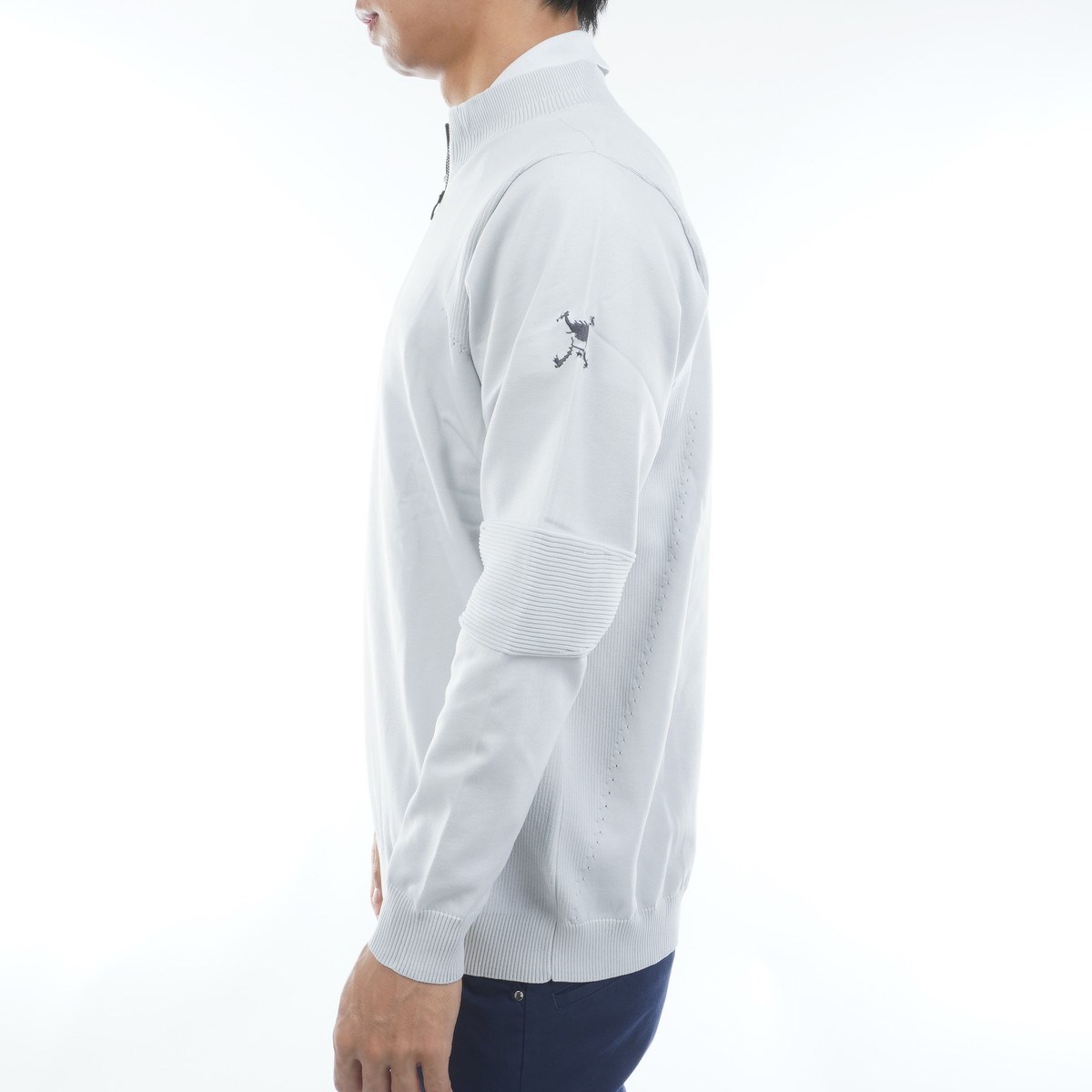 ハイゲージで表現されたクリーンな見た目に袖の肘部分の編み地は動きに合わせた伸び方向で成形した編地を採用。