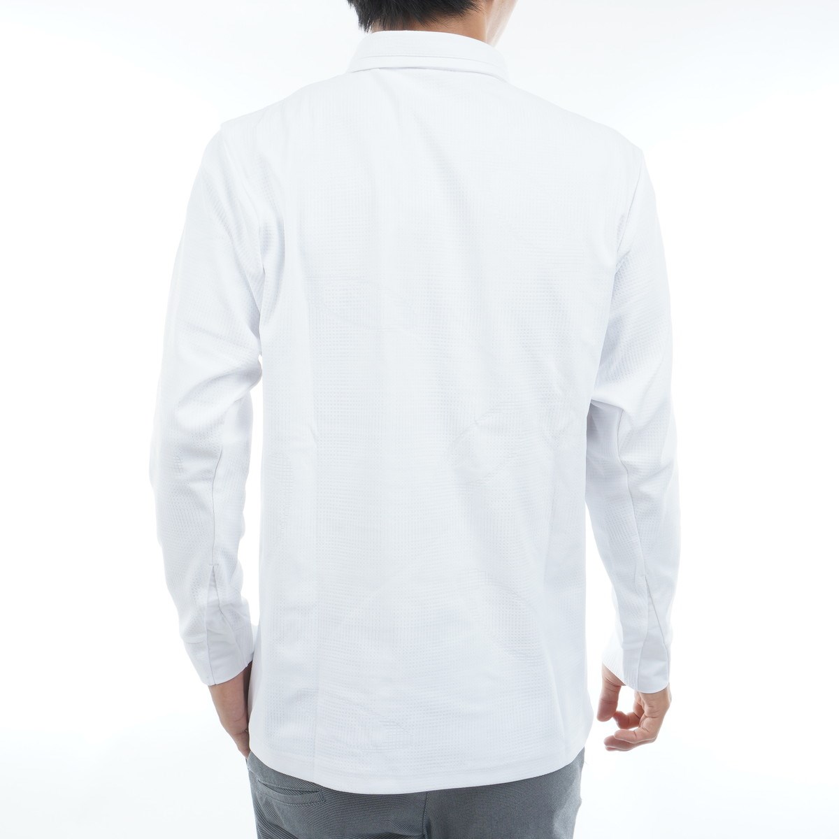 ジャガード編みで小柄を表現した吸汗速乾素材を採用した長袖ポロシャツ。