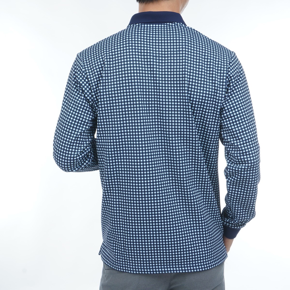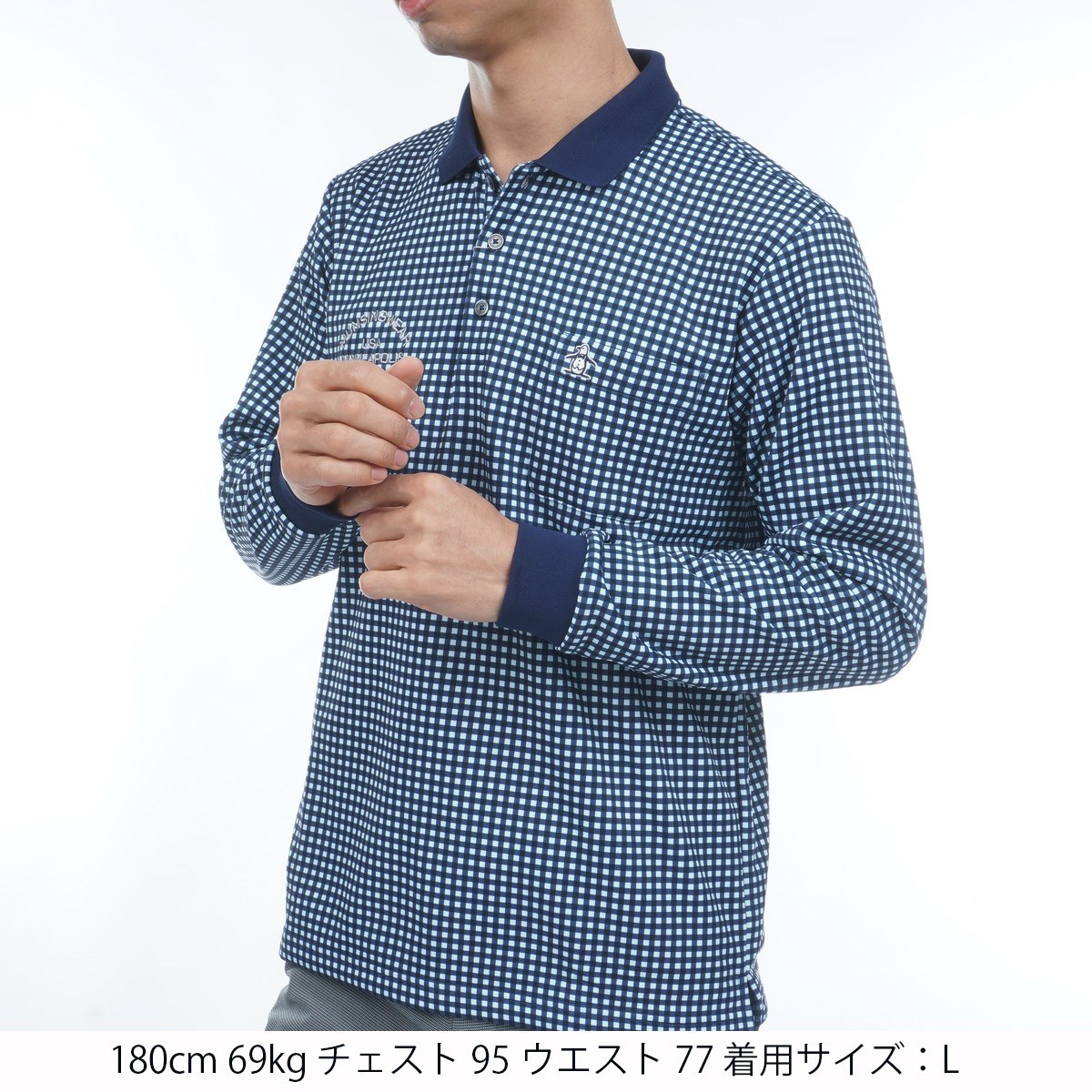マンシングウェア Munsingwear ストレッチ HEAT NAVI ギンガムチェック総柄プリント 長袖ポロシャツ M ネイビー 00