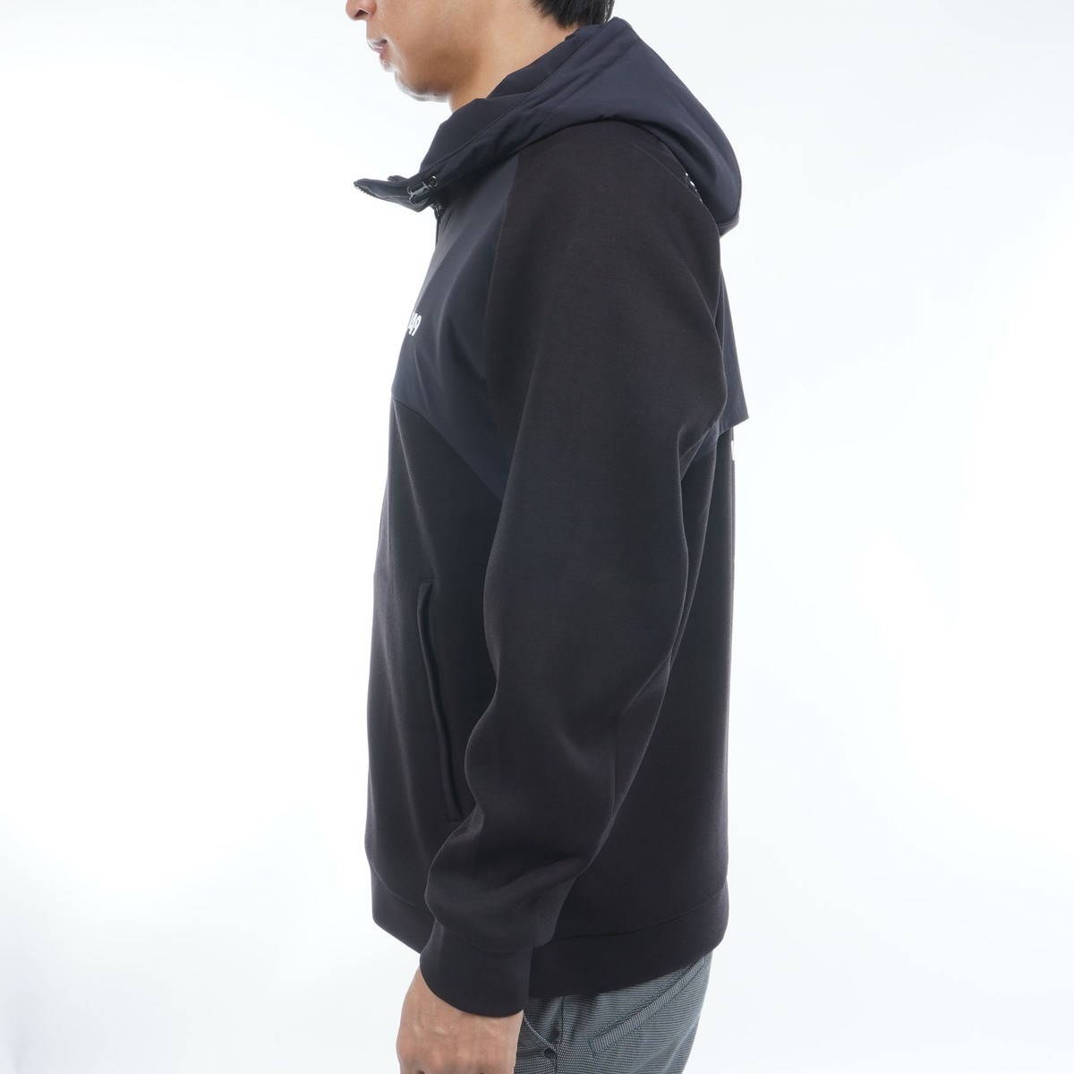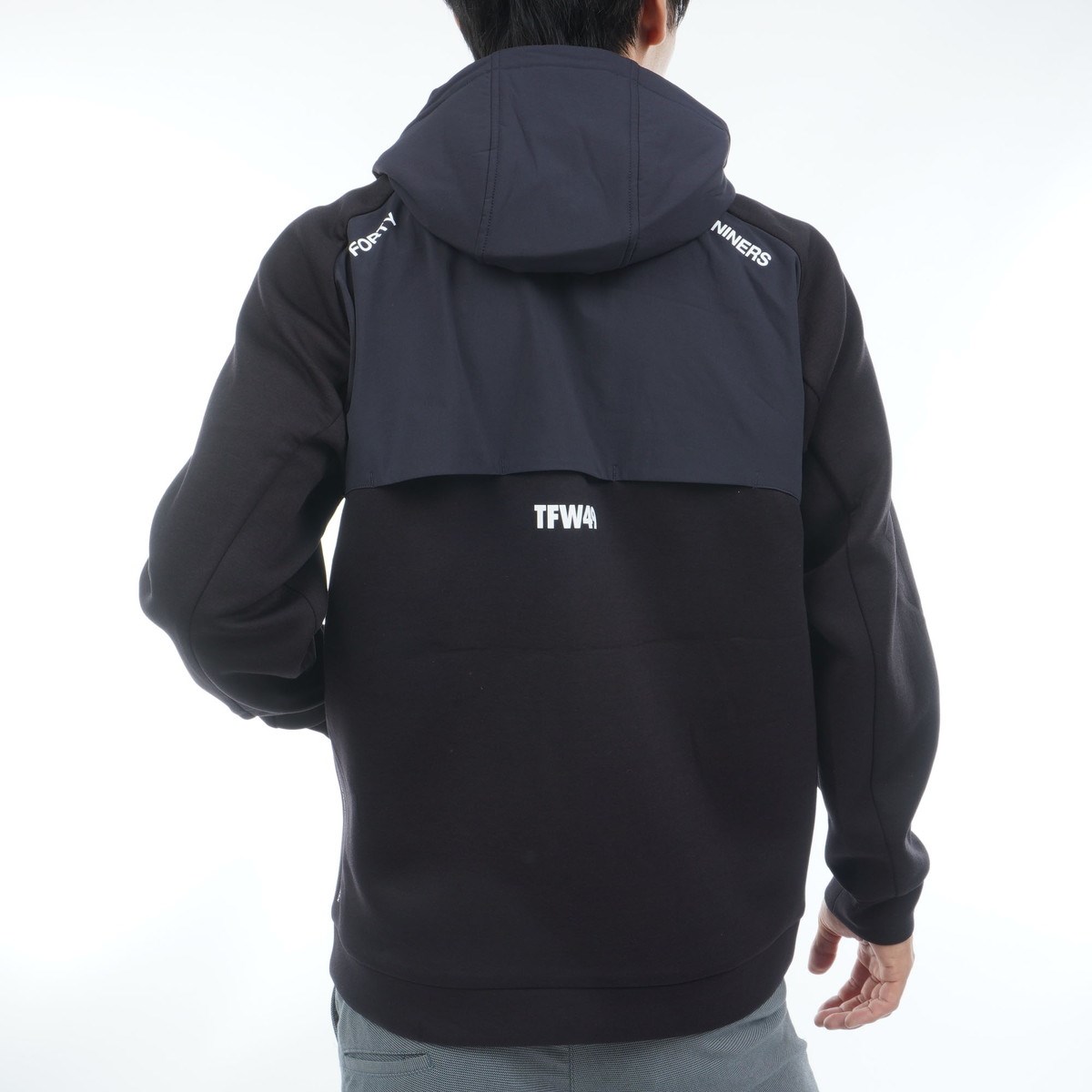 フードや前後身頃上部の配色部分には、ナイロンの仮撚りのフルダル糸を使用した防シワ性・2WAYストレッチ性に優れたドライタッチの2WAY素材を、本体の上から重ねています。