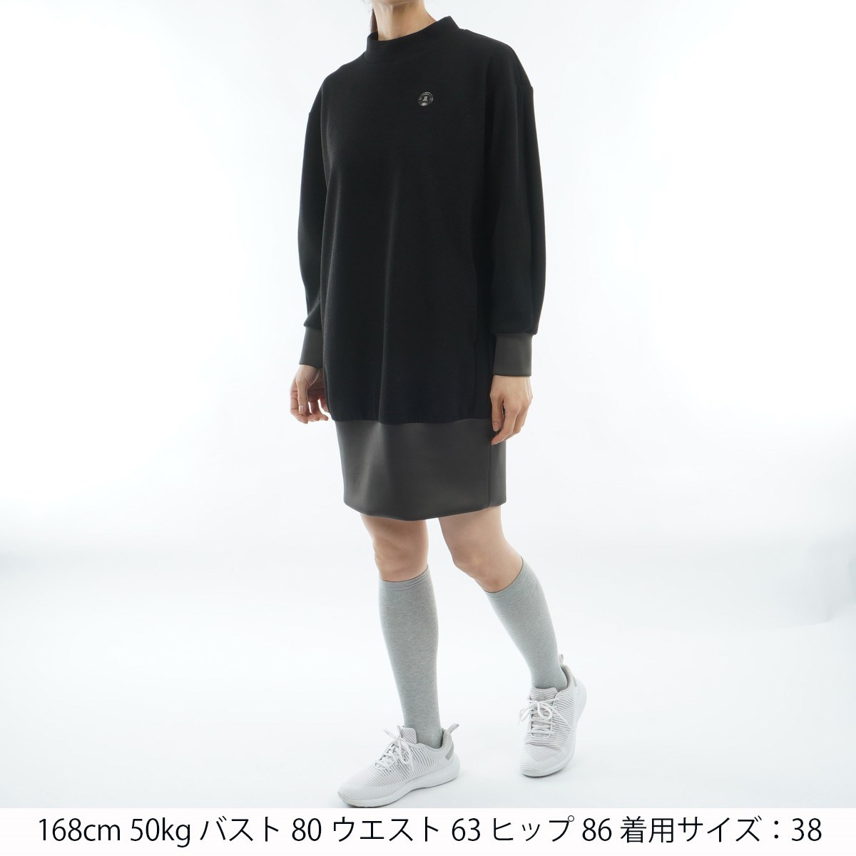 温かみのある起毛ストレッチジャージを本体に、裾にはすっきりとしたダンボールカットソーを使用した異素材配色のハイネックワンピースです。