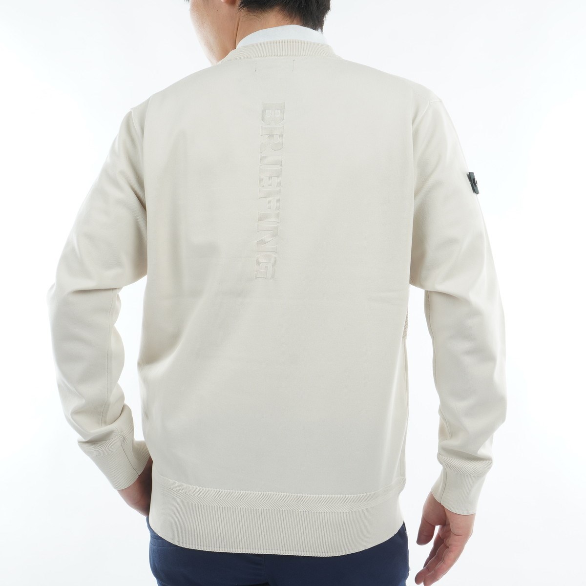 背面にあしらわれたBRIEFINGロゴが目を引くクルーネックセーター。