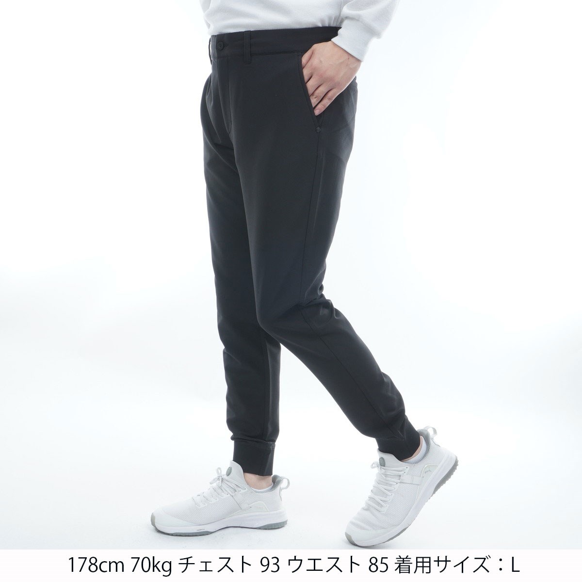 すっきりともたつきのない着こなしと温かさどちらも叶えるジョガーパンツは冬のゴルフコーデの主役に最適な1着。