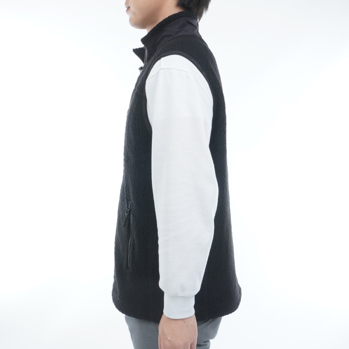 スポーティーな印象のジップアップベストをウールボアフリースで仕立てることで、上品さを演出。