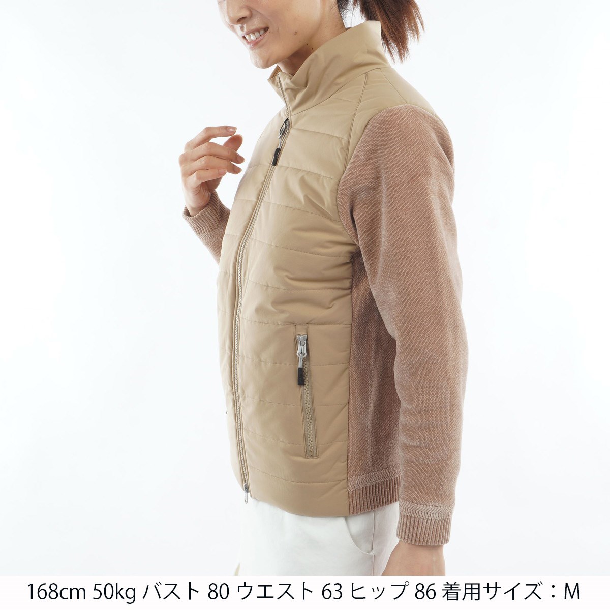 ・前身頃の表地には縦横自由自在に伸縮するストレッチ性と、優れた撥水性を持った素材を、袖や後ろ身頃には光沢感と柔らかな質感が特徴的なニットを使用。