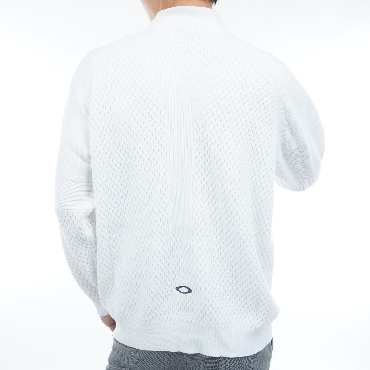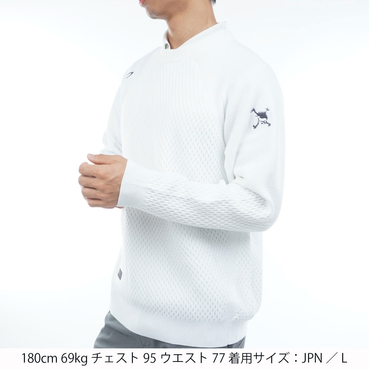 身頃と袖先部分はベタつきの少ない凹凸感のある編地で表現し、袖の上側と肘、アームホール部分にはリブ編みを配置し、伸縮性をサポート。