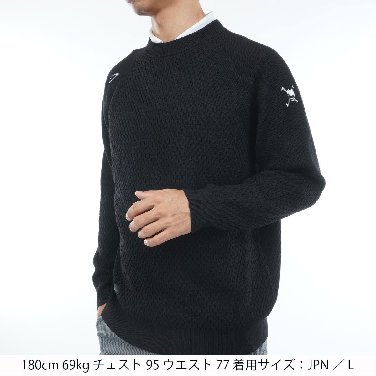 身頃と袖先部分はベタつきの少ない凹凸感のある編地で表現し、袖の上側と肘、アームホール部分にはリブ編みを配置し、伸縮性をサポート。