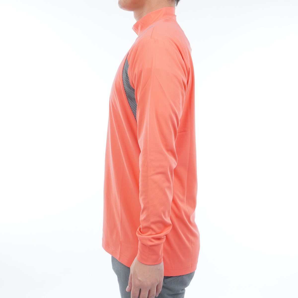 モックネックタイプなので首元までカバーして暖かく、ストレッチ機能がついた動きやすいアイテム。