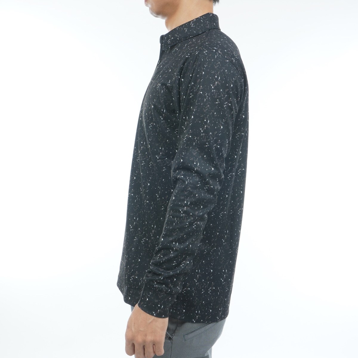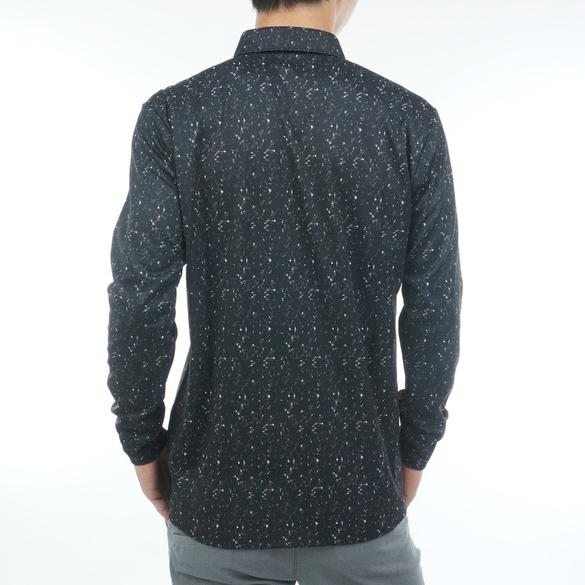 裏起毛のリーフプリント柄の長袖ポロシャツ。