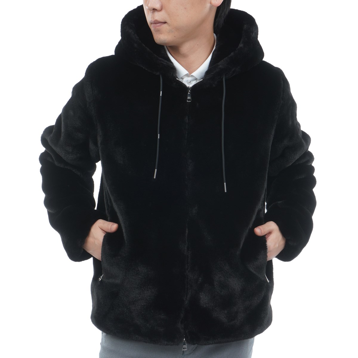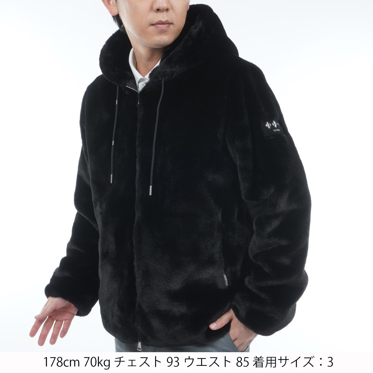 リュクスな艶を放つエコファー素材を使用したフード付きブルゾン。