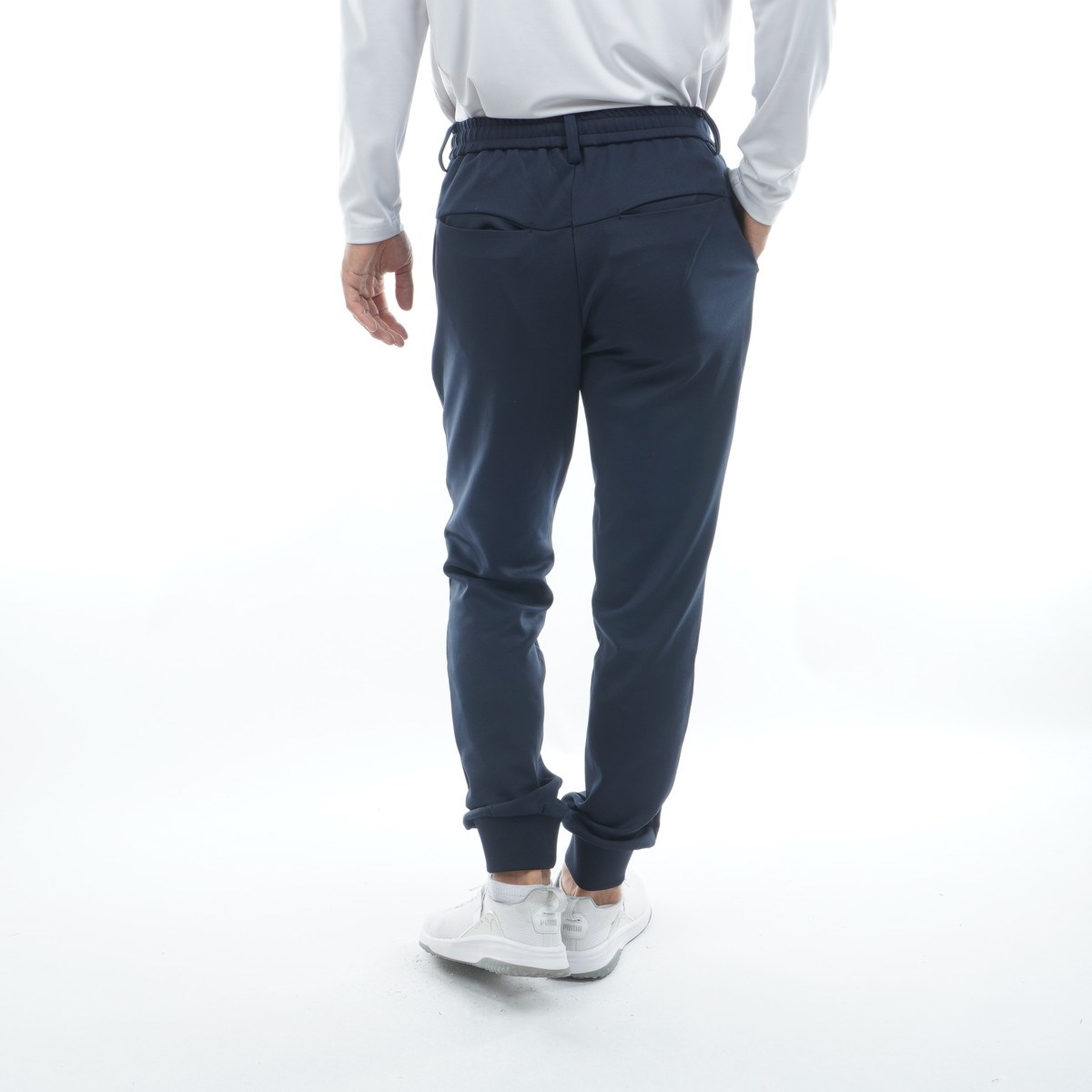 ウエストゴム仕様でベルトループと内側スピンドル紐付き、ティーアップやグリーンでのしゃがむ動作も窮屈感を感じません。