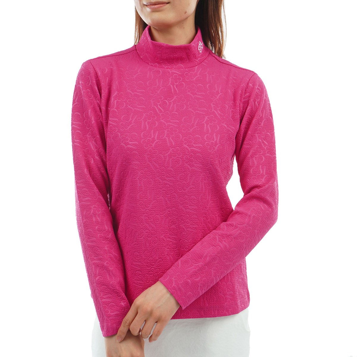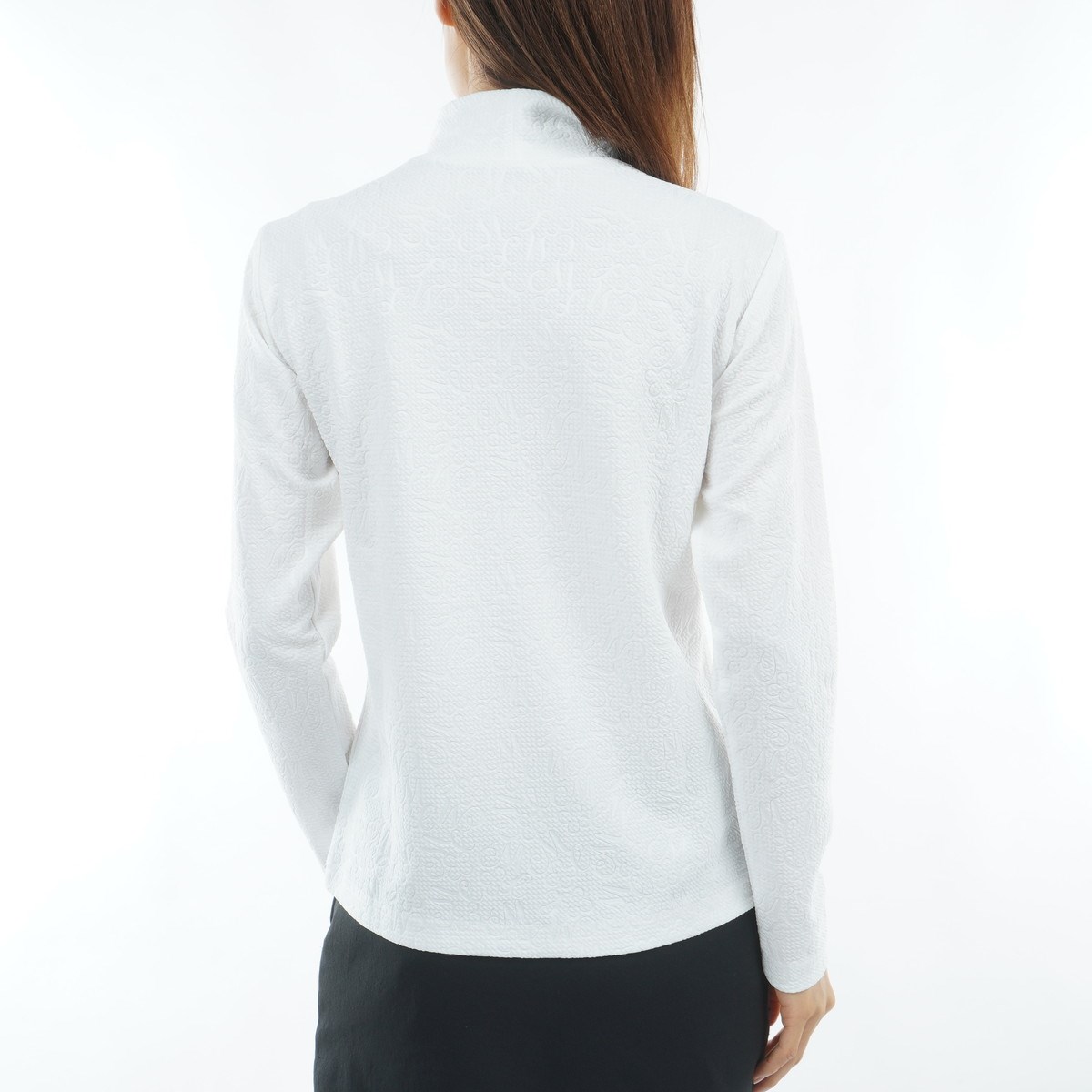 膨れジャカード素材にオリジナルロゴのエンボス加工を施したモックネック長袖シャツ。