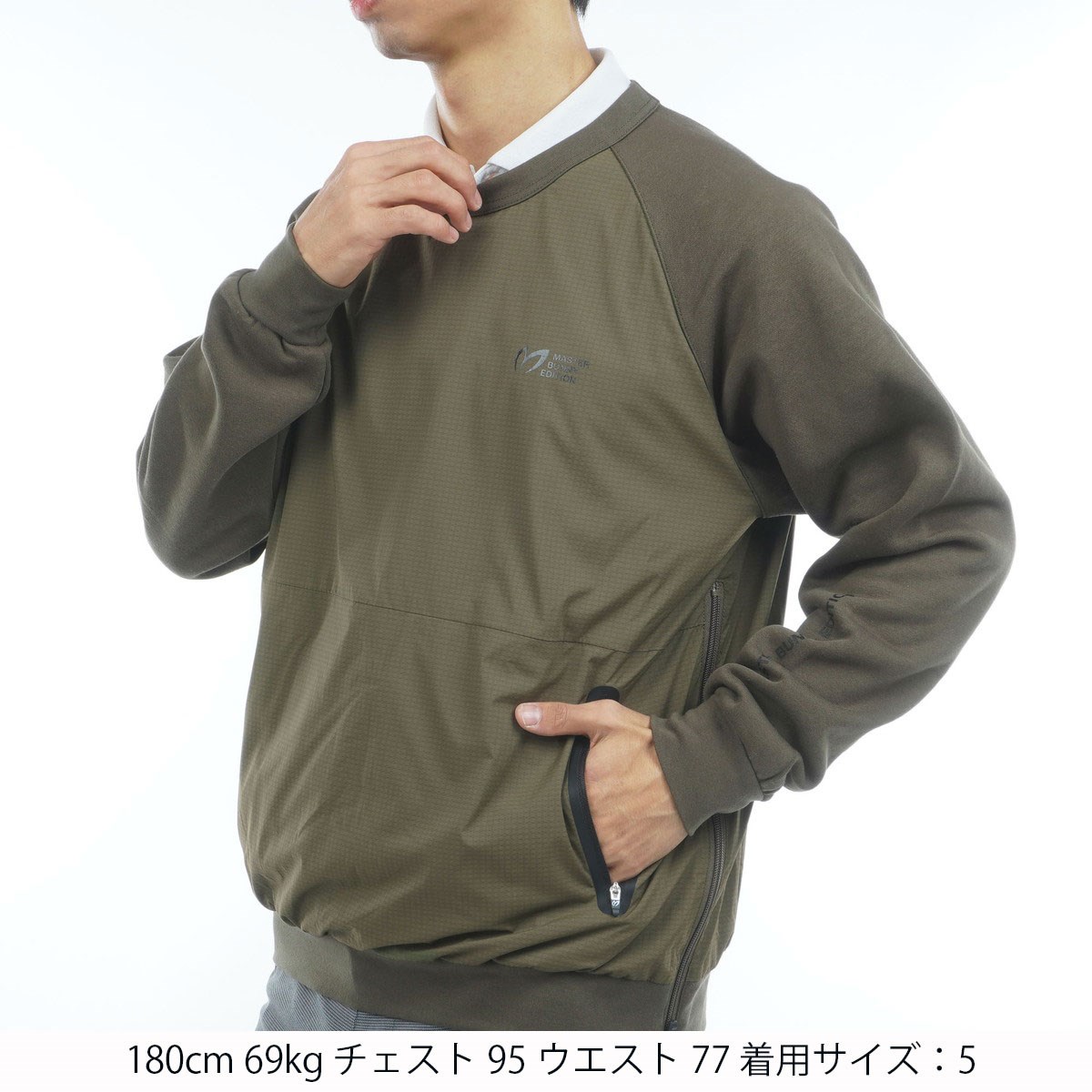 | 素材 | 表生地身頃部分:ナイロン88%、ポリウレタン12%/袖部分:コットン69%、ポリエステル31%/リブ部分:コットン59%、ポリエステル38%、ポリウレタン3%/裏生地:ポリエステル100% |