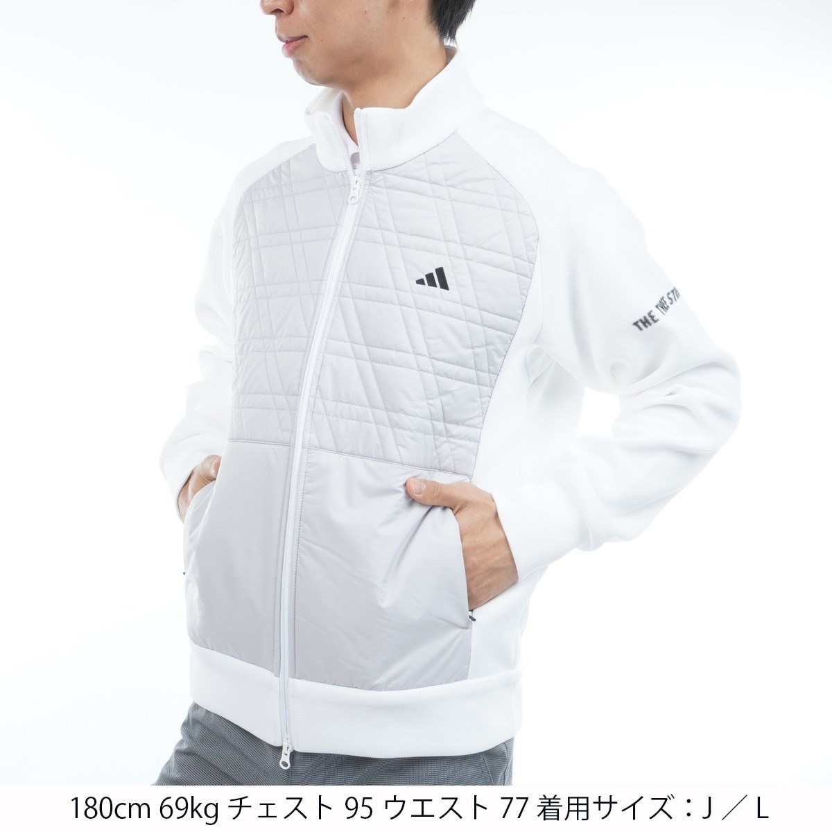 前身頃に薄中綿を配置し、スウェット素材と組み合わせることで、軽量性と保温性を両立したゴルフ用ジャケット。