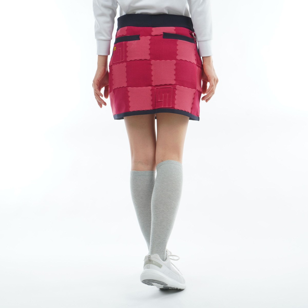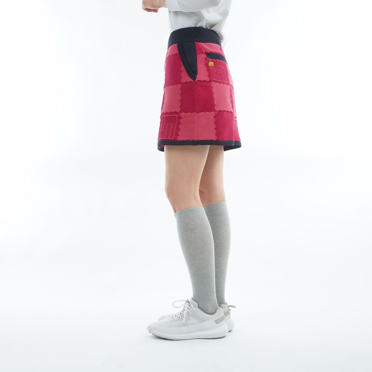 蓄熱裏地付き、軽量で暖かく撥水性をもったニット素材のスカートは動きやすく、遊び心あふれる手書き風のブロック柄が特徴です。