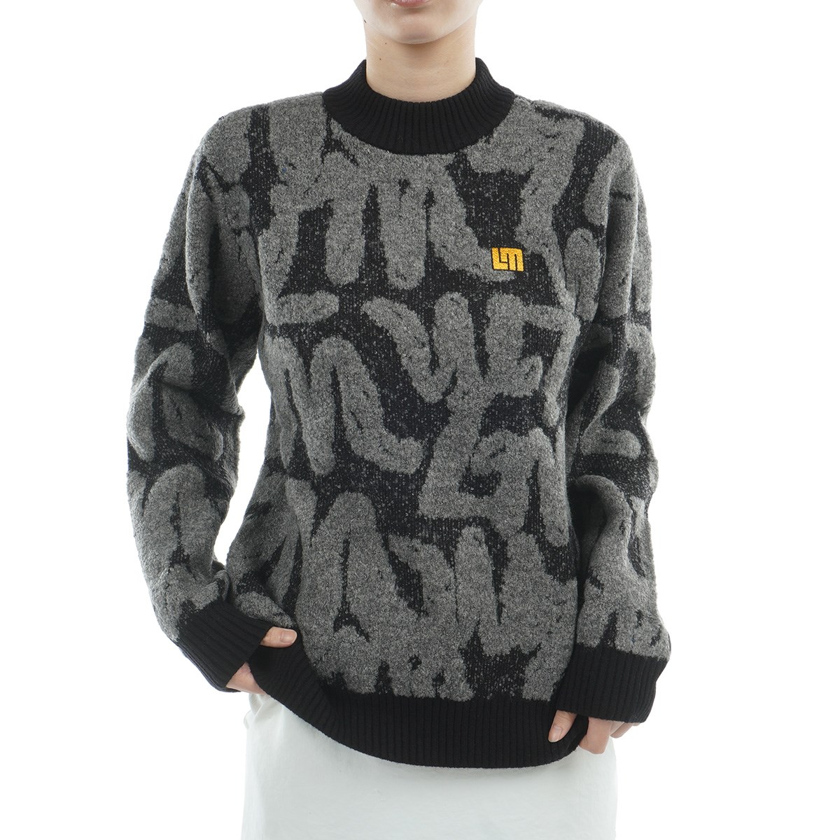 ツイード調の糸とブークレーでロゴを立体的に表現した、凹凸感のあるデザインセーター。