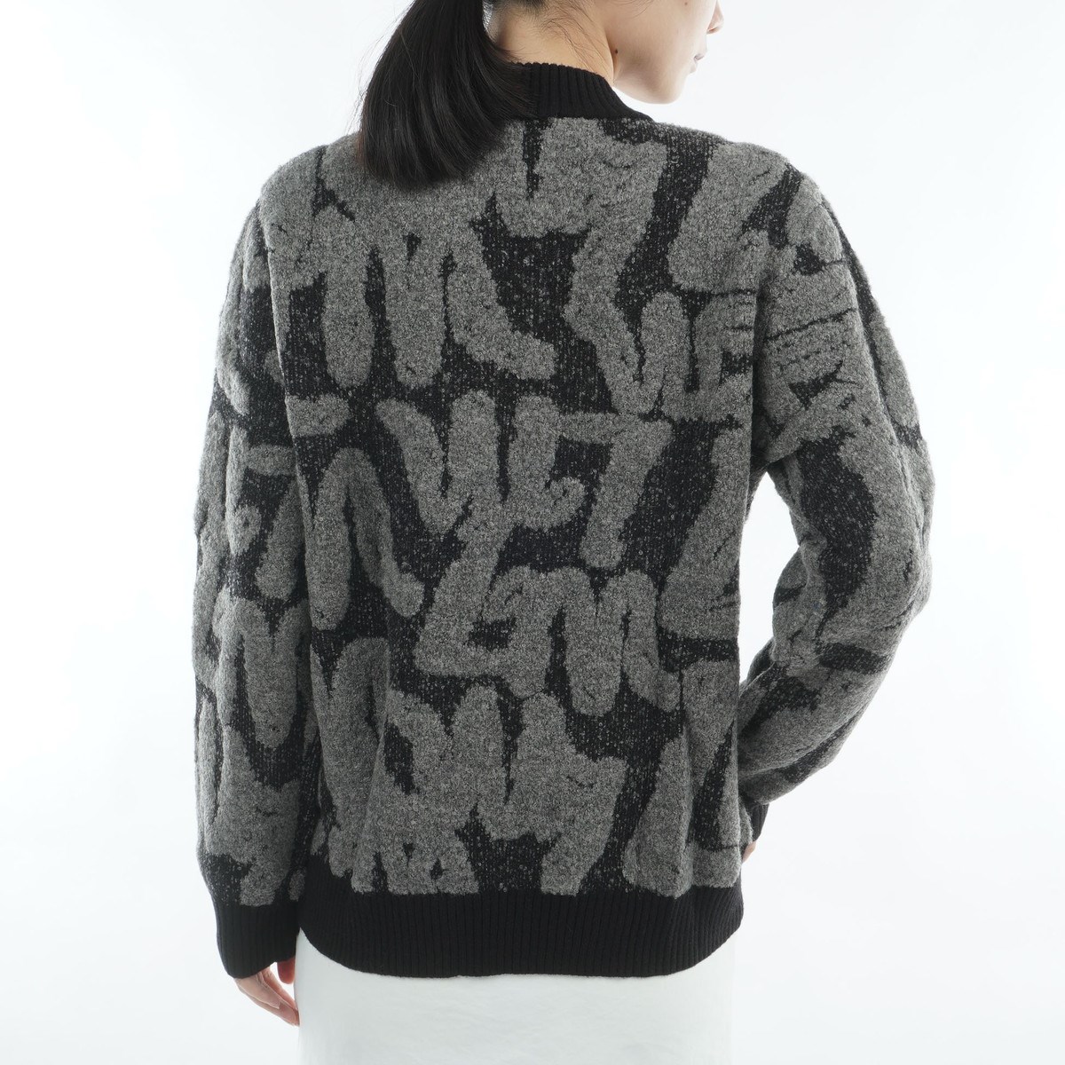 ツイード調の糸とブークレーでロゴを立体的に表現した、凹凸感のあるデザインセーター。