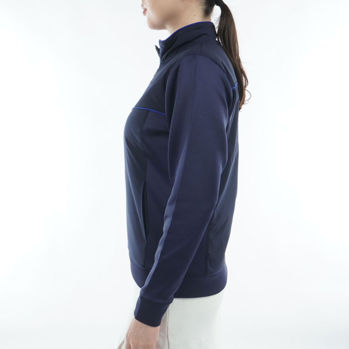 胸の切り替えと衿端の配色パイピングや左胸のロゴ刺繍が、さりげないアクセントに。