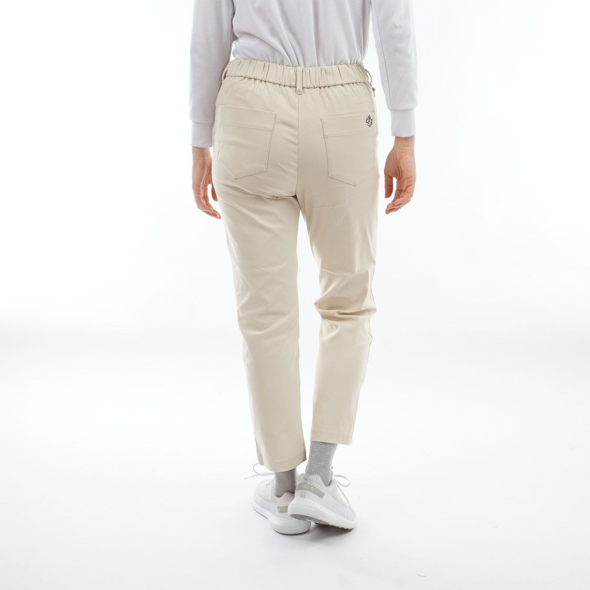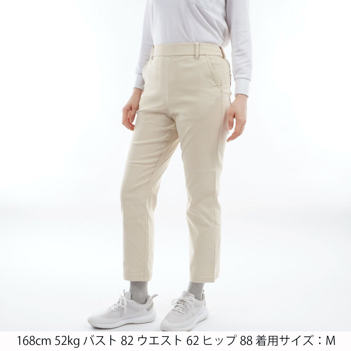 程よいフィット感のストレートシルエットでスタイルアップを叶えつつ、ウエスト後ろはギャザー入りゴム仕様+内側スピンドル紐付き、フィット感も調整可能でラクチンな履き心地です。