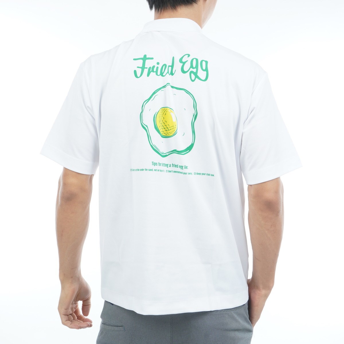 適度なオーバーサイズのシルエットに、フロントには胸ポケットにBのワンポイントロゴを配置し、バックにはバンカーに埋まったボールを目玉焼きに見立てた「Fried Egg」のグラフィック。