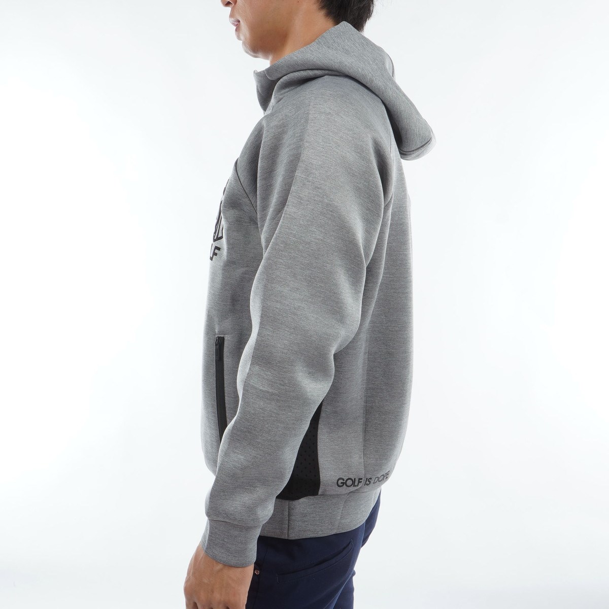 軽量性と通気性を兼ね備えたダンボールニット素材を使用したフーディー。