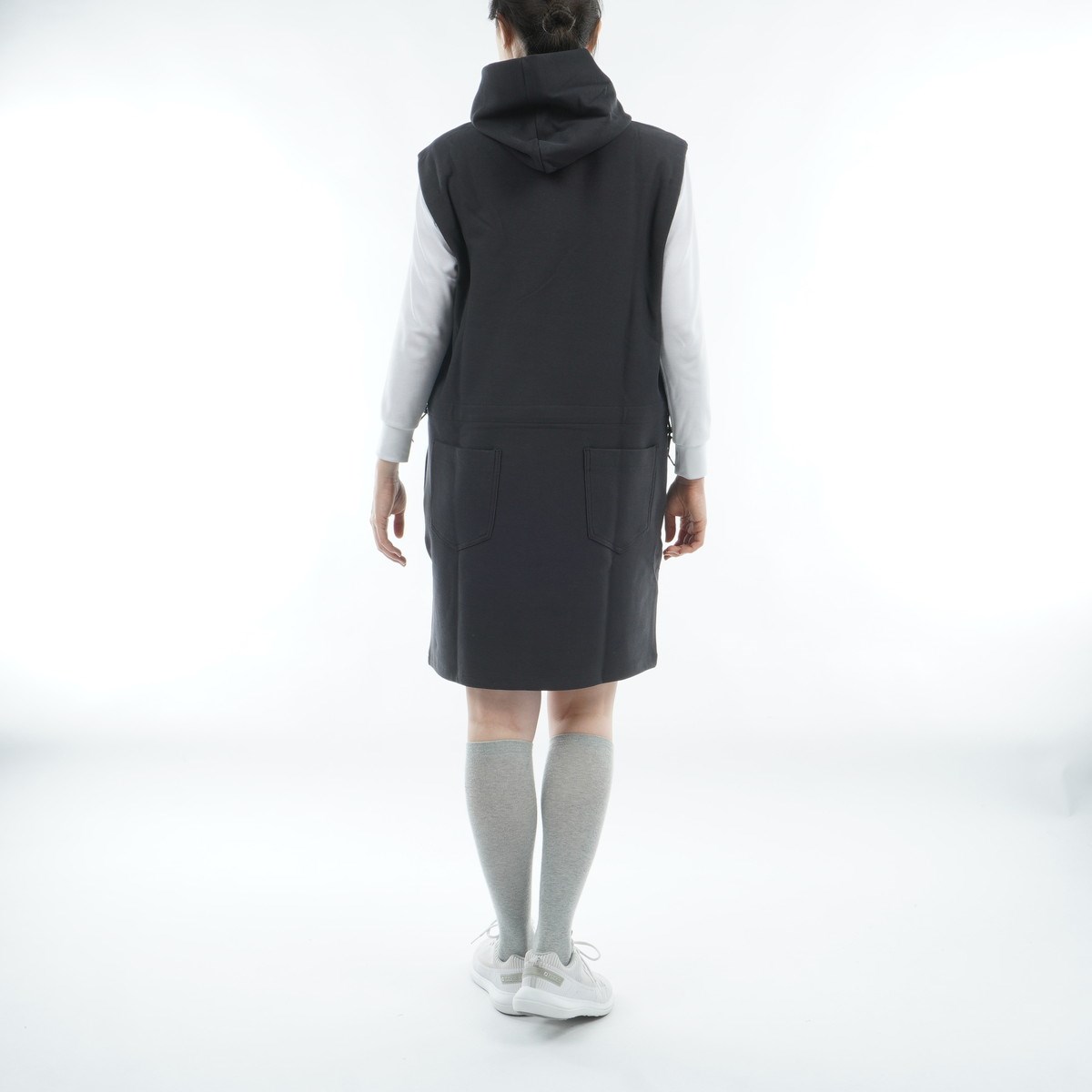 ストレッチジャージのような柔らかさと暖かさを備えた、フーディーベストタイプのワンピース。