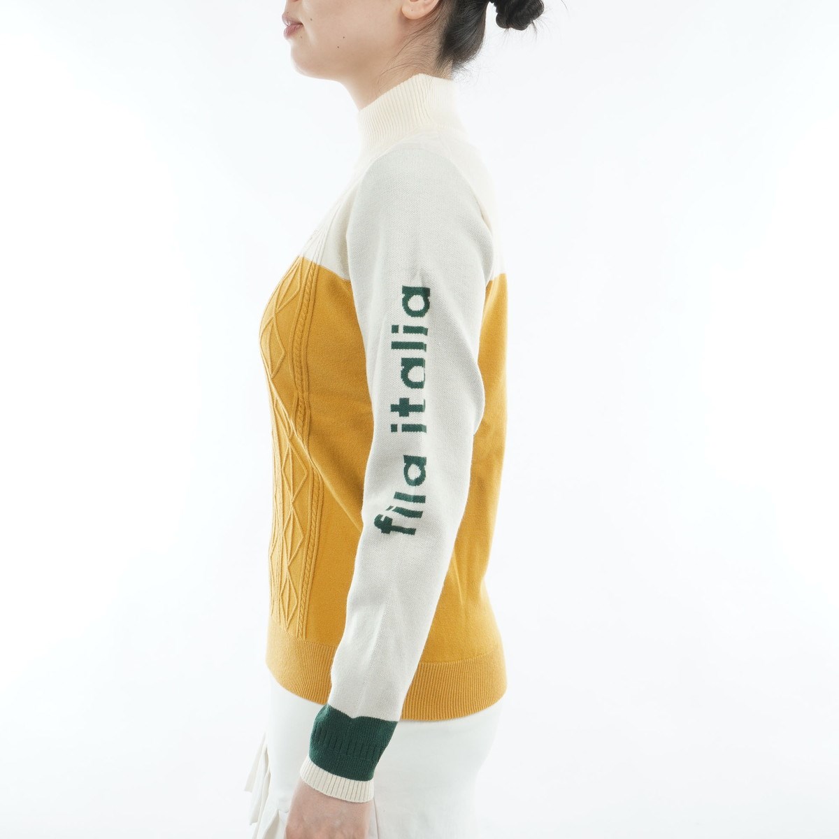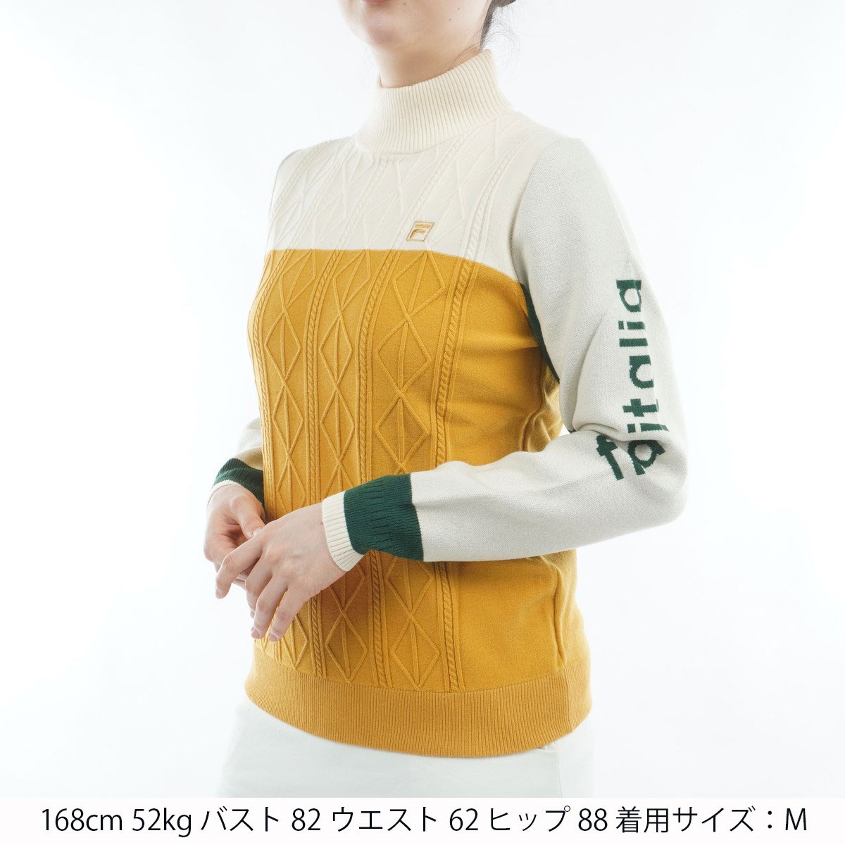FILAらしいブロック配色の切り替えデザインがスタイリングのアクセントになり、ケーブル編地の表情が暖かでやさしい印象を添えます。