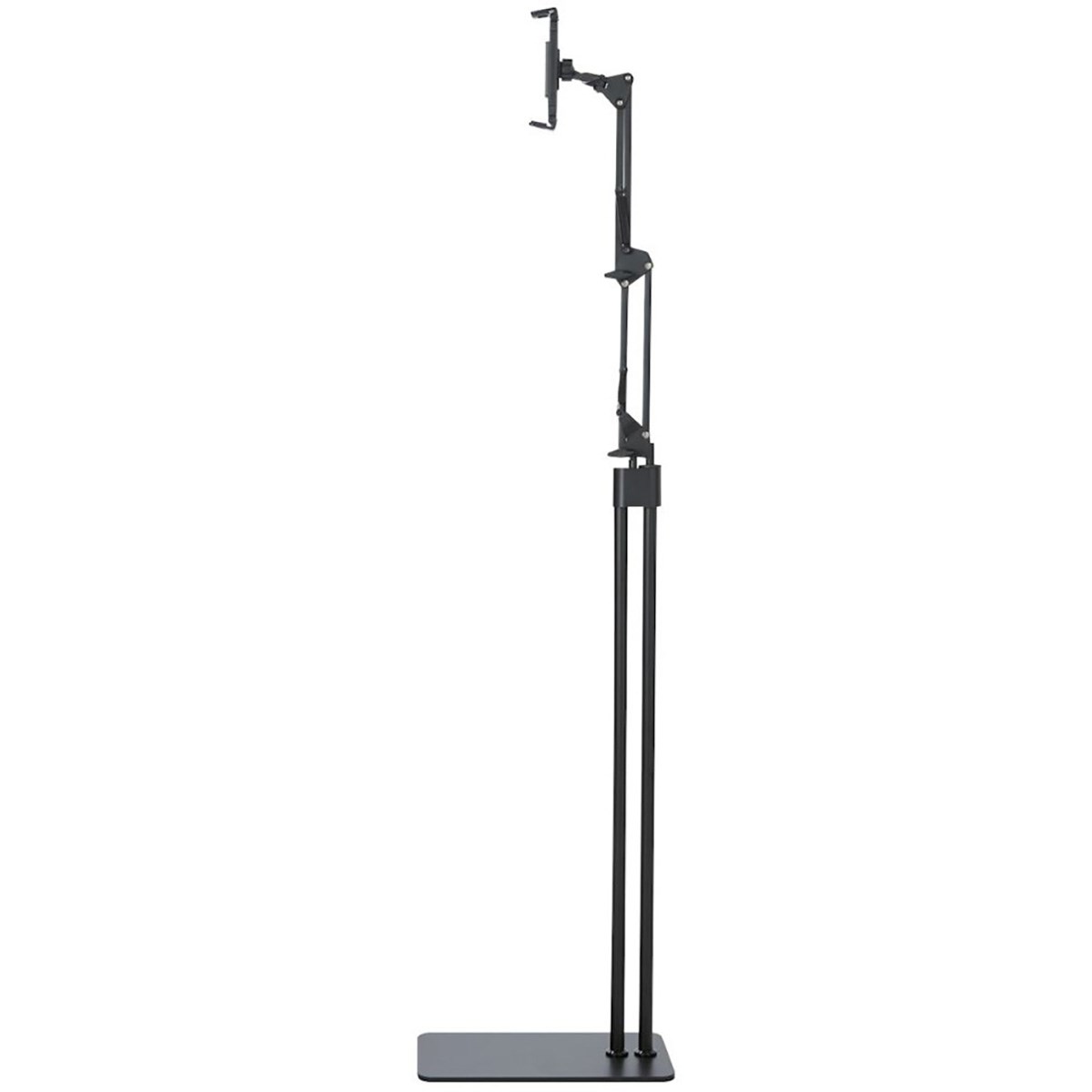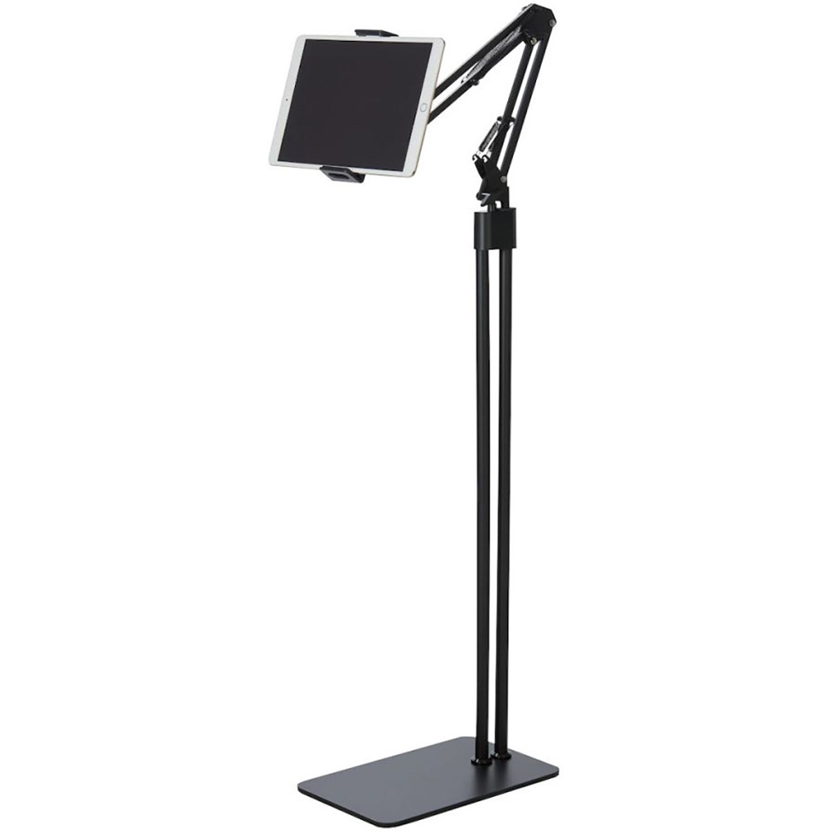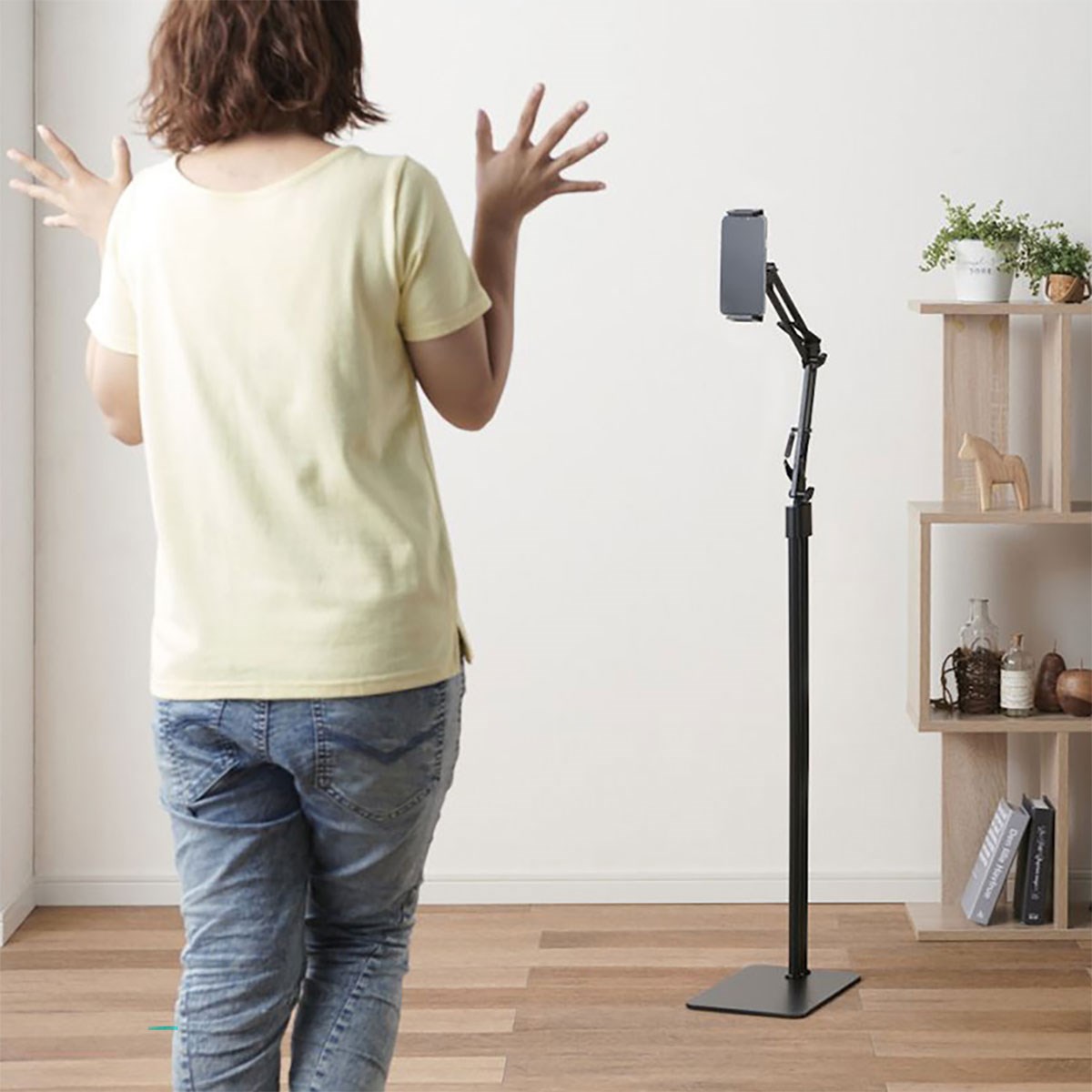 しっかりした台座に装着した支柱とアームによって、広い空間や部屋の中央でも高さを保持してスマートフォンやタブレットを使用できる床置式フレキシブルアームスタンド。