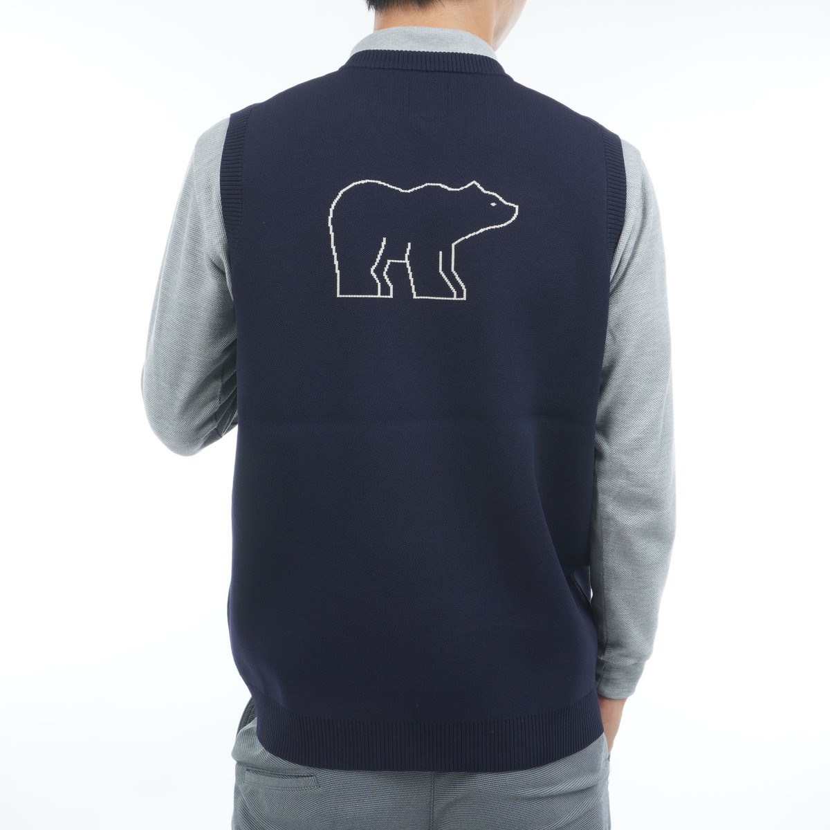 クマを後身頃に施したポリエステルニットベストです。