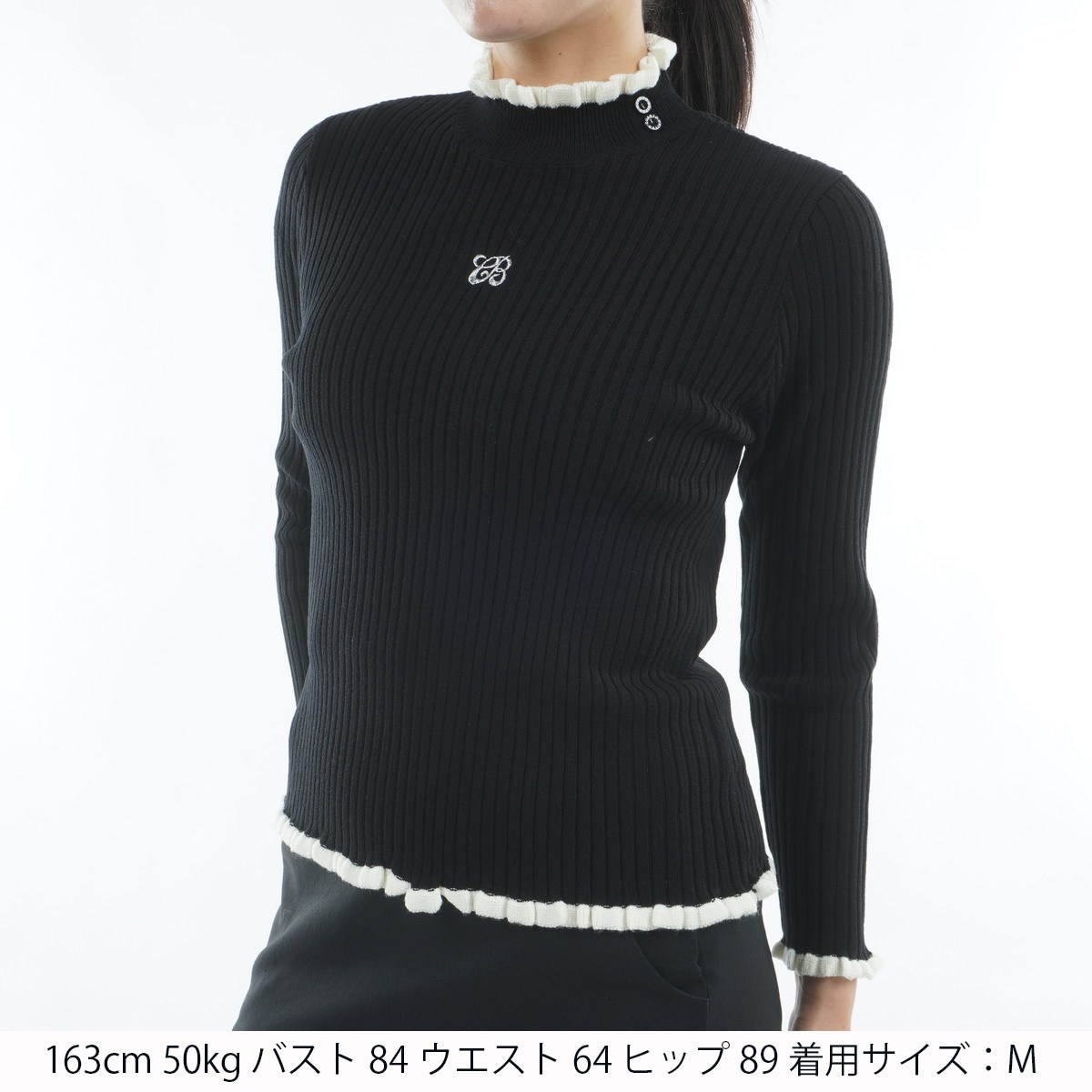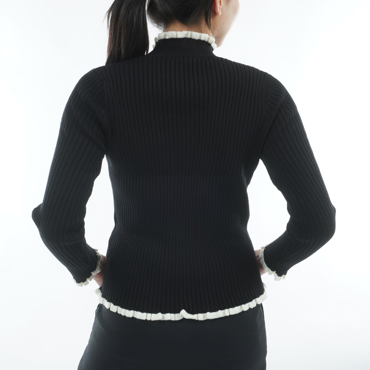 袖口とネックラインにあしらった配色フリルが、顔まわりを華やかに見せてくれるリブニットセーター。