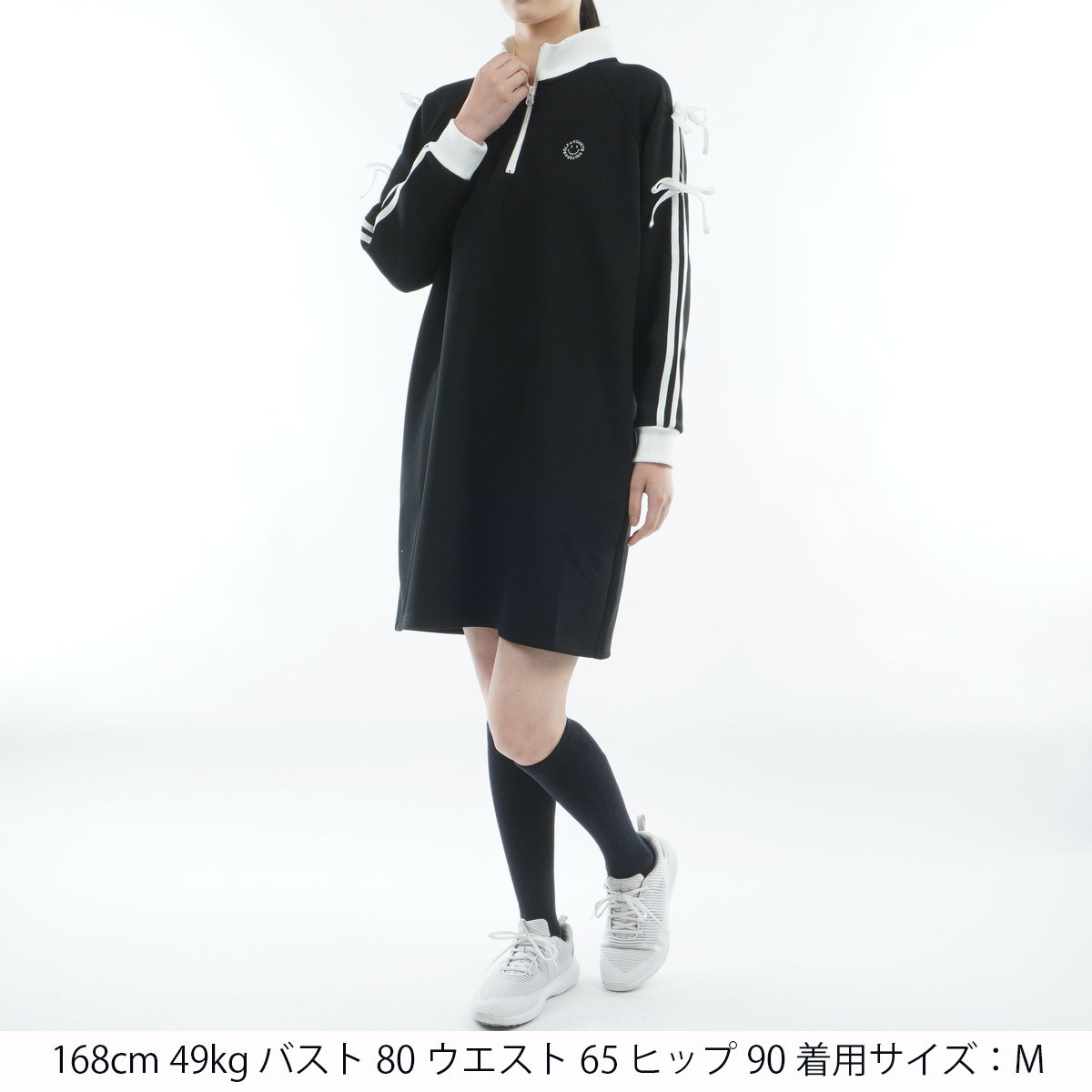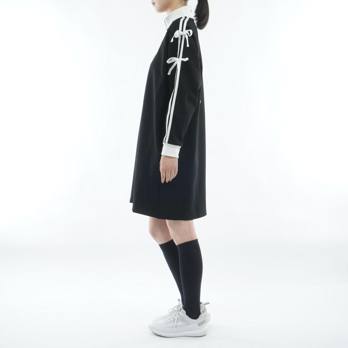 袖のラインとリボンデザインが目を引く、スポーティ&フェミニンなワンピース。