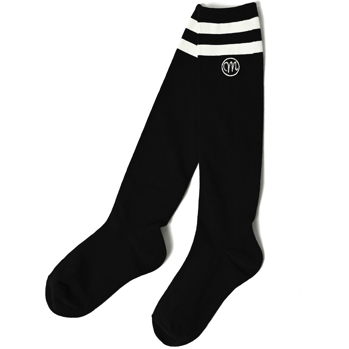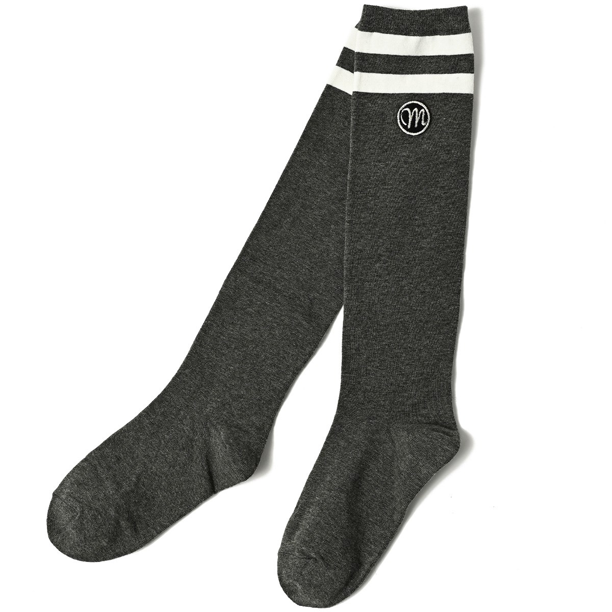 配色ダブルラインとロゴ刺繍ワッペンがアクセントのハイソックス。