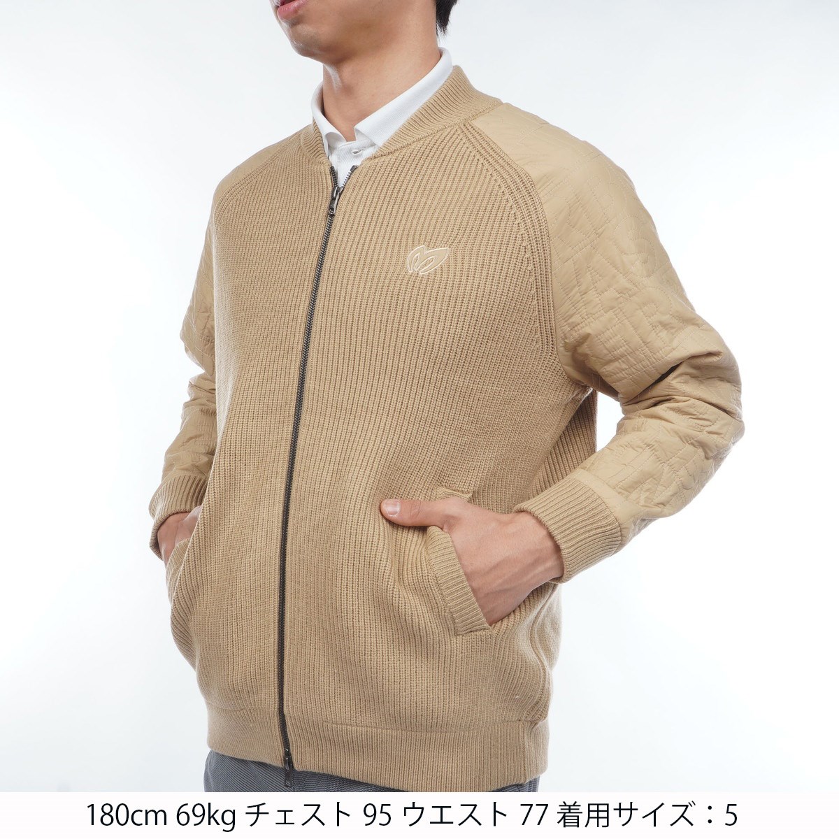 | 素材 | 表生地(ニット部分):アクリル49%、ナイロン33%、ポリエステル13%、毛5%/袖部分:ナイロン100%/中綿・袖裏:ポリエステル100% |