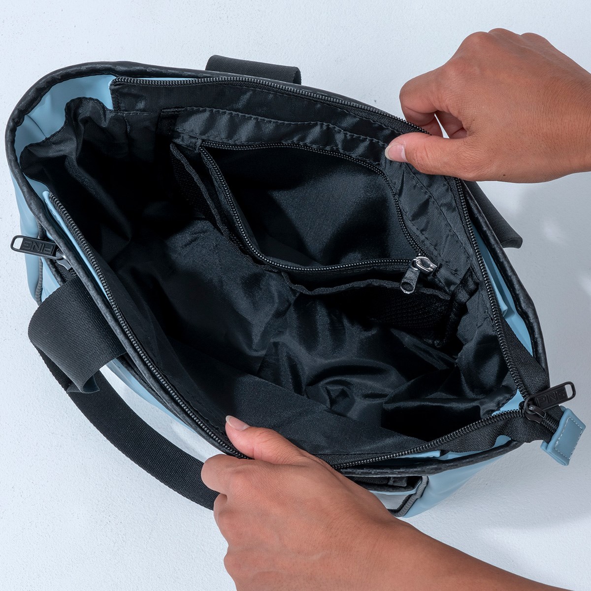 アウターには前面のジップ付きポケット、インナーには吊りポケット付き。」
