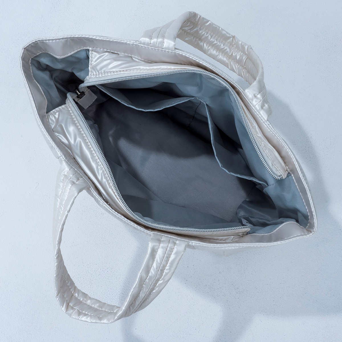 ・デザイン「パフバッグをイメージしたキルティング加工と光沢感のあるポリウレタン素材が「映える」ラウンドトートバッグ。